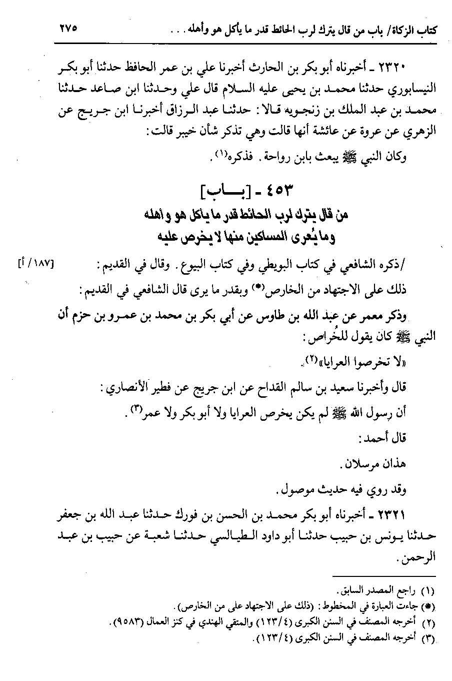 453 - باب ) ( من قال يترك لرب الحائط قدر ما يأكل هو وأهله وما يُعرى المساكين منها لا يخرص عليها )