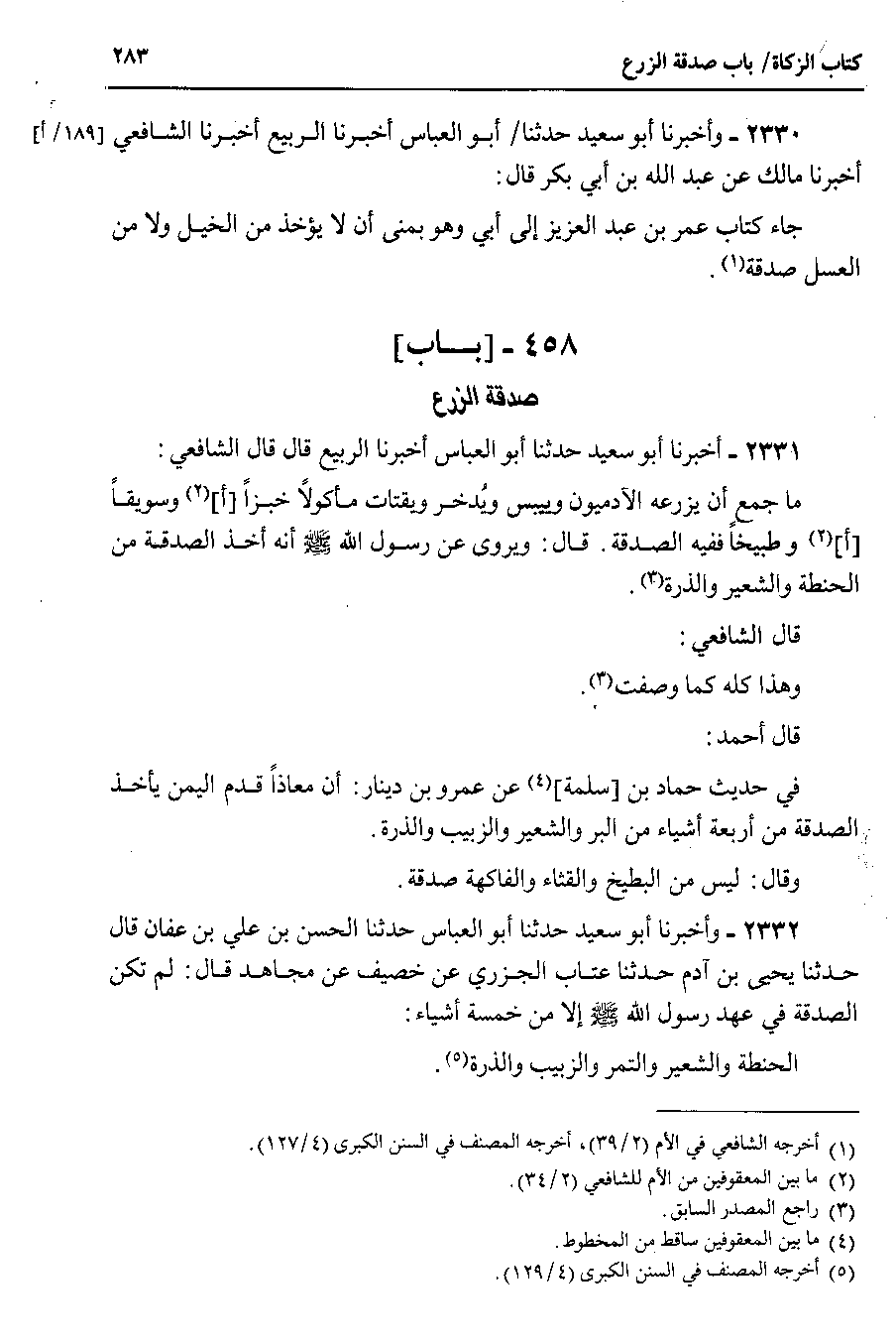 2331 - أخبرنا أبو سعيد حدثنا أبو العباس أخبرنا الربيع قال قال الشافعي ما جمع أن يزرعه الآدميون وييبس ويدخر ويقتات مأكولاً خبزاً أ وسويقاً أ وطبيخاً ففيه الصدقة . قال : ويروى عن رسول الله صلى الله عليه وسلم أنه أخذ الصدقة من الحنطة والشعير والذرة.