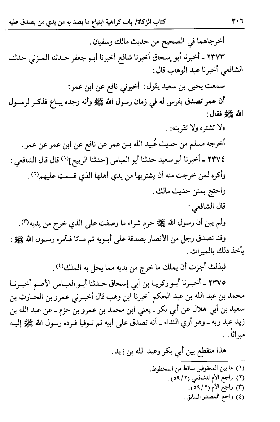 2373 - أخبرنا أبو إسحاق أخبرنا شافع أخبرنا أبو جعفر حدثنا المزني حدثنا الشافعي أخبرنا عبد الوهاب قال سمعت يحيى بن سعيد يقول : أخبرني نافع عن ابن عمر أن عمر تصدق بفرس له في زمان رسول الله صلى الله عليه وسلم وأنه وجده يباع فذكر لرسول الله صلى الله عليه وسلم فقال لا تشتره ولا تقربنه.