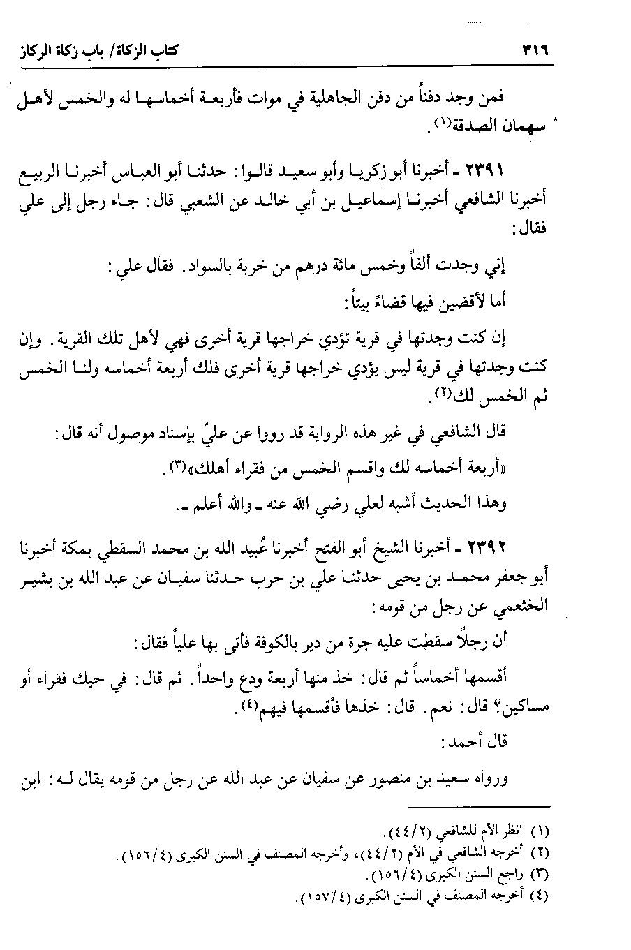 2391 - أخبرنا أبو زكريا وأبو سعيد قالوا : حدثنا أبو العباس أخبرنا الربيع أخبرنا الشافعي أخبرنا إسماعيل بن أبي خالد عن الشعبي قال : جاء رجل إلى علي فقال إني وجدت ألفاً وخمس مِئَة درهم من خربة بالسواد . فقال علي أما لأقضين فيها قضاءً بيتاً.
