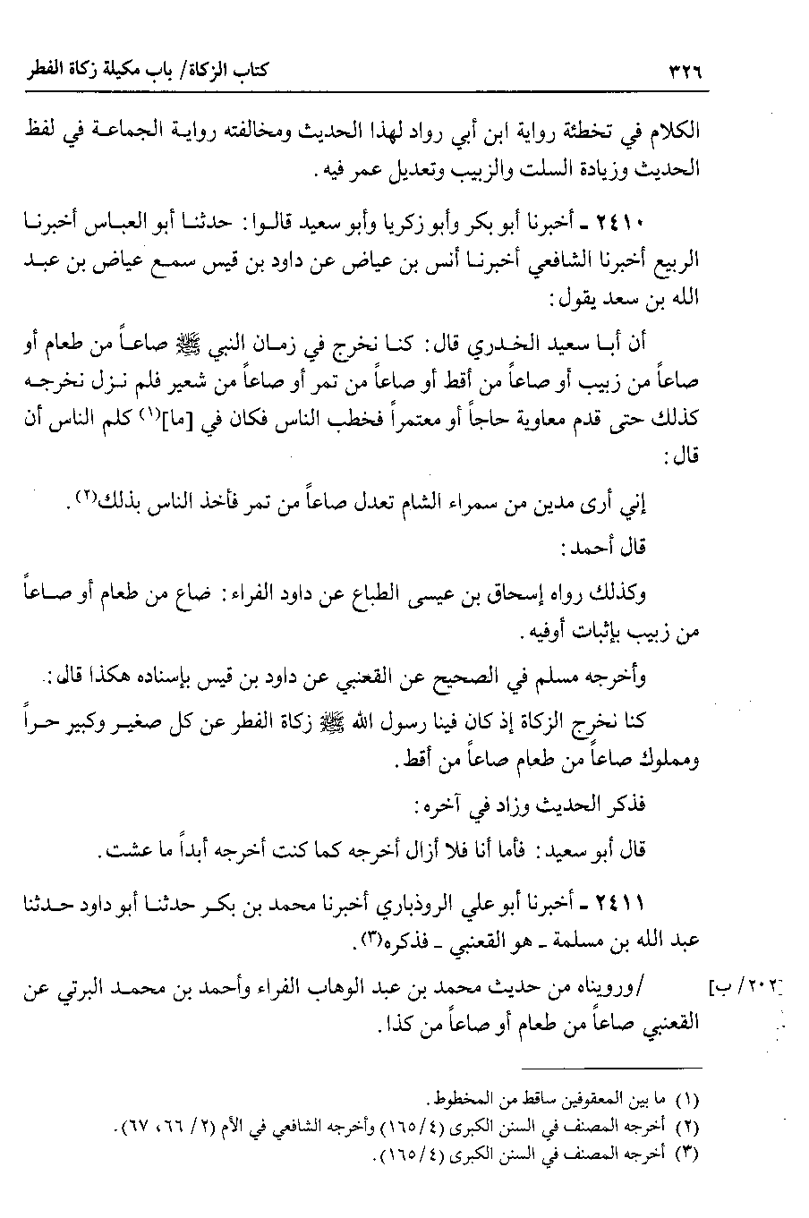 2410 - أخبرنا أبو بكر وأبو زكريا وأبو سعيد قالوا : حدثنا أبو العباس أخبرنا الربيع أخبرنا الشافعي أخبرنا أنس بن عياض عن داود بن قيس سمع عياض بن عبد الله بن سعد يقول أن أبا سعيد الخدري قال : كنا نخرج في زمان النبي صلى الله عليه وسلم صاعاً من طعام أو صاعاً من زبيب أو صاعاً من أقط أو صاعاً من تمر أو صاعاً من شعير فلم نزل نخرجه كذلك حتى قدم معاوية حاجاً أو معتمراً فخطب الناس فكان في ما كلم الناس أن قال إني أرى مدين من سمراء الشام تعدل صاعاً من تمر فأخذ الناس بذلك.