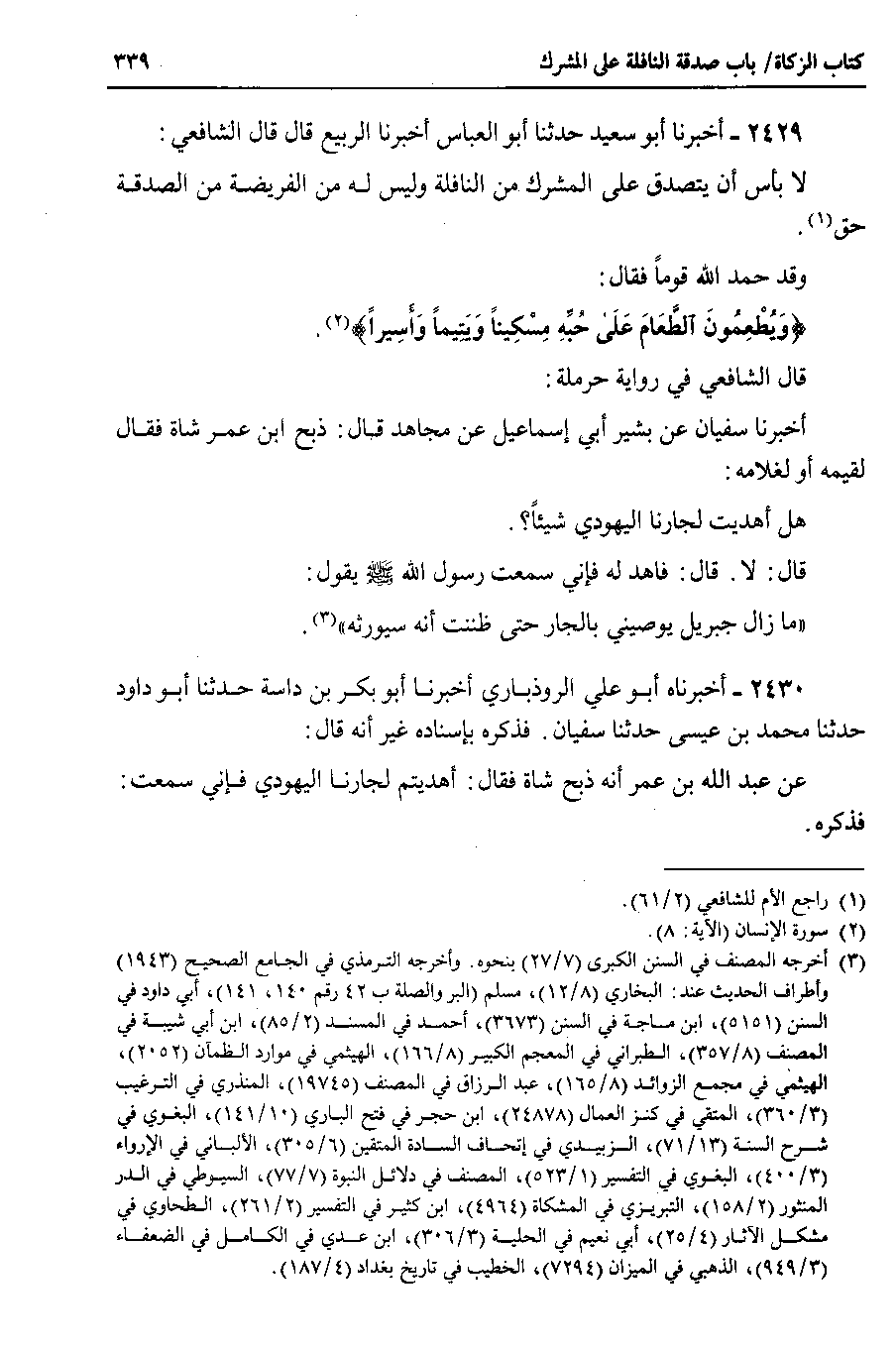 قال الشافعي في رواية حرملة أخبرنا سفيان عن بشير أبي إسماعيل عن مجاهد قال : ذبح ابن عمر شاة فقال لقيمه أو لغلامه هل أهديت لجارنا اليهودي شيئاً ؟.