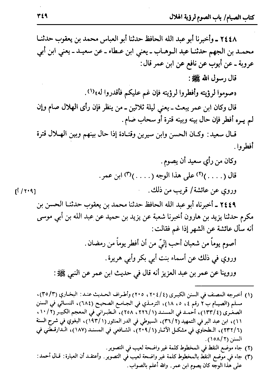 2448 - وأخبرنا أبو عبد الله الحافظ حدثنا أبو العباس محمد بن يعقوب حدثنا محمد بن الجهم حدثنا عبد الوهاب _ يعني ابن عطاء _ عن سعيد _ يعني ابن أبي عروبة _ عن أيوب عن نافع عن ابن عمر قال قال رسول الله صلى الله عليه وسلم صوموا لرؤيته وأفطروا لرؤيته فإن غم عليكم فأقدروا له.