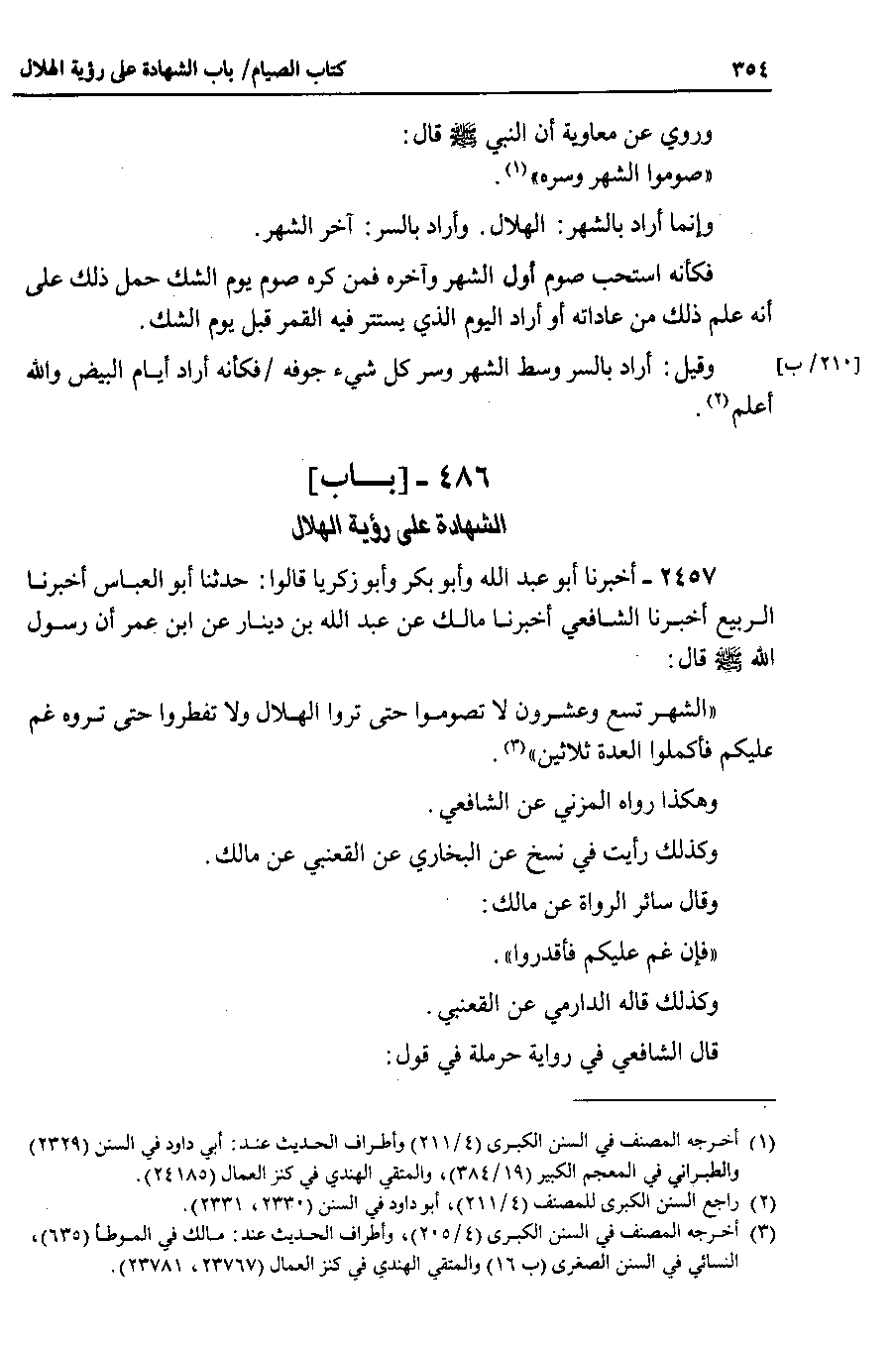 2457 - أخبرنا أبو عبد الله وأبو بكر وأبو زكريا قالوا : حدثنا أبو العباس أخبرنا الربيع أخبرنا الشافعي أخبرنا مالك عن عبد الله بن دينار عن ابن عمر أن رسول الله صلى الله عليه وسلم قال الشهر تسع وعشرون لا تصوموا حتى تروا الهلال ولا تفطروا حتى تروه غم عليكم فأكملوا العدة ثلاثين.