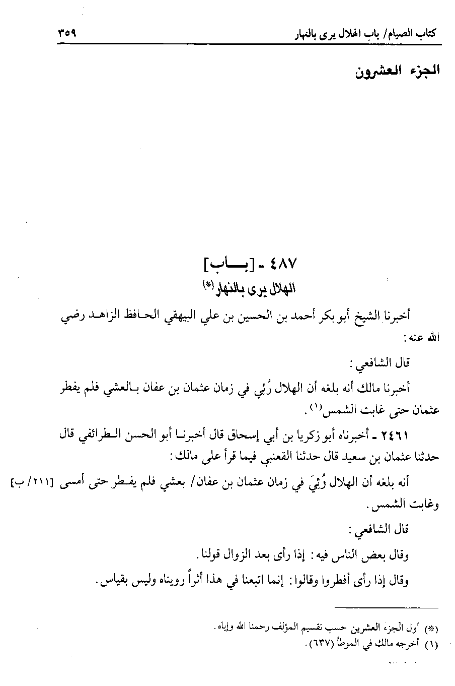 أَخْبَرَنَا الشيخ أبو بكر أحمد بن الحسين بن علي البيهقي الحافظ الزاهد رضي الله عنه قال الشافعي أخبرنا مالك أنه بلغه أن الهلال رئي في زمان عثمان بن عفان بالعشي فلم يفطر عثمان حتى غابت الشمس.