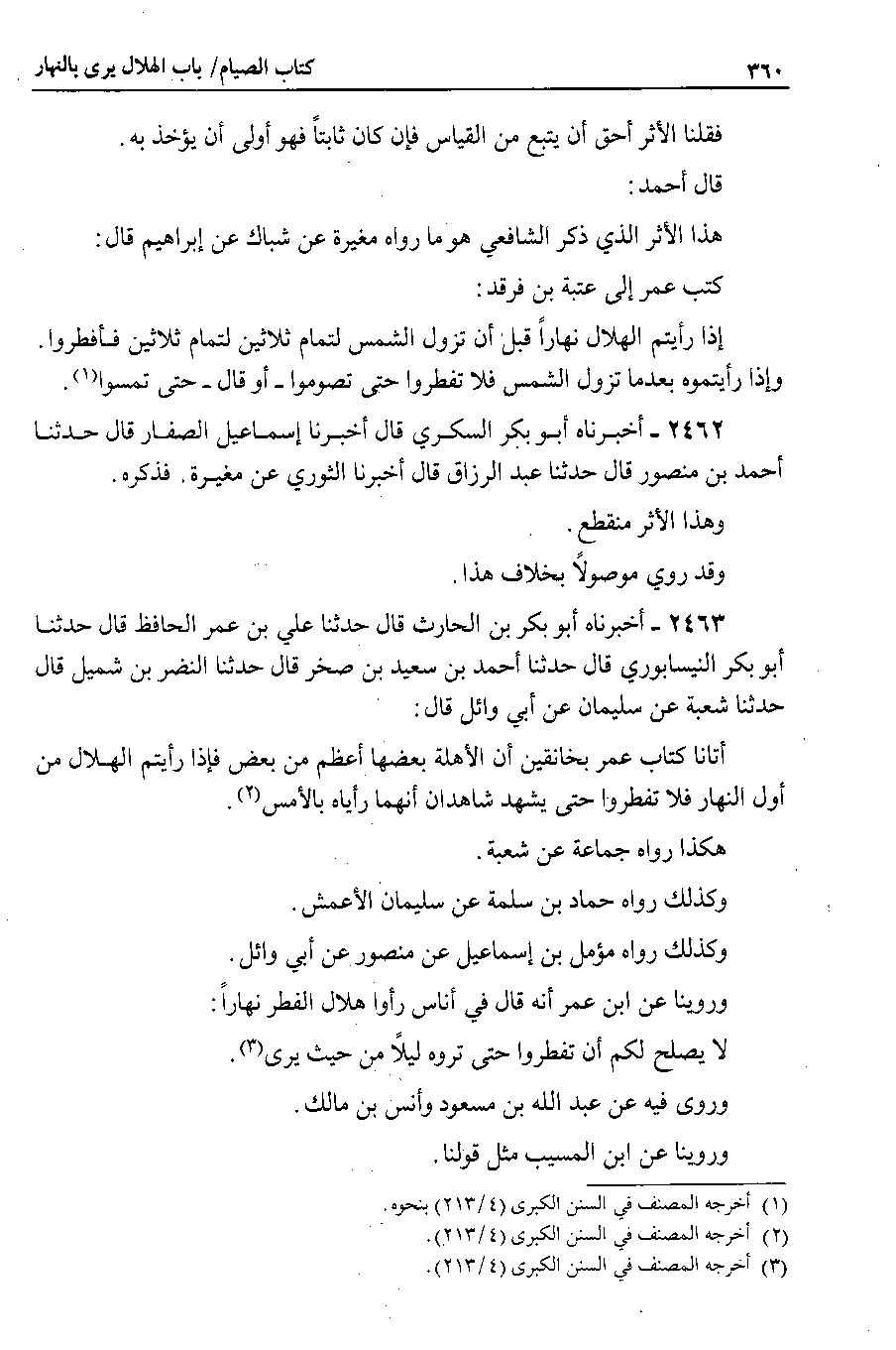 2463 - أخبرناه أبو بكر بن الحارث قال حدثنا علي بن عمر الحافظ قال حدثنا أبو بكر النيسابوري قال حدثنا أحمد بن سعيد بن صخر قال حدثنا النضر بن شميل قال حدثنا شعبة عن سليمان عن أبي وائل قال أتانا كتاب عمر بخانقين أن الأهلة بعضها أعظم من بعض فإذا رأيتم الهلال من أول النهار فلا تفطروا حتى يشهد شاهدان أنهما رأياه بالأمس.
