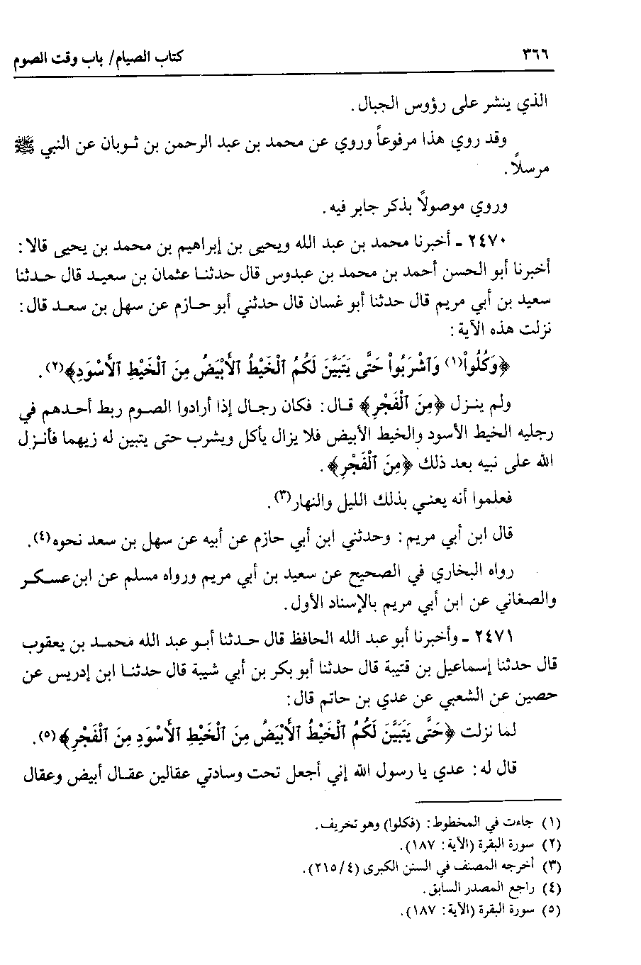 2471 - وأخبرنا أبو عبد الله الحافظ قال حدثنا أبو عبد الله محمد بن يعقوب قال حدثنا إسماعيل بن قتبية قال حدثنا أبو بكر بن أبي شيبة قال حدثنا ابن إدريس عن حصين عن الشعبي عن عدي بن حاتم قال لما نزلت {حتى يتبين لكم الخيط الأبيض من الخيط الأسود من الفجر}.