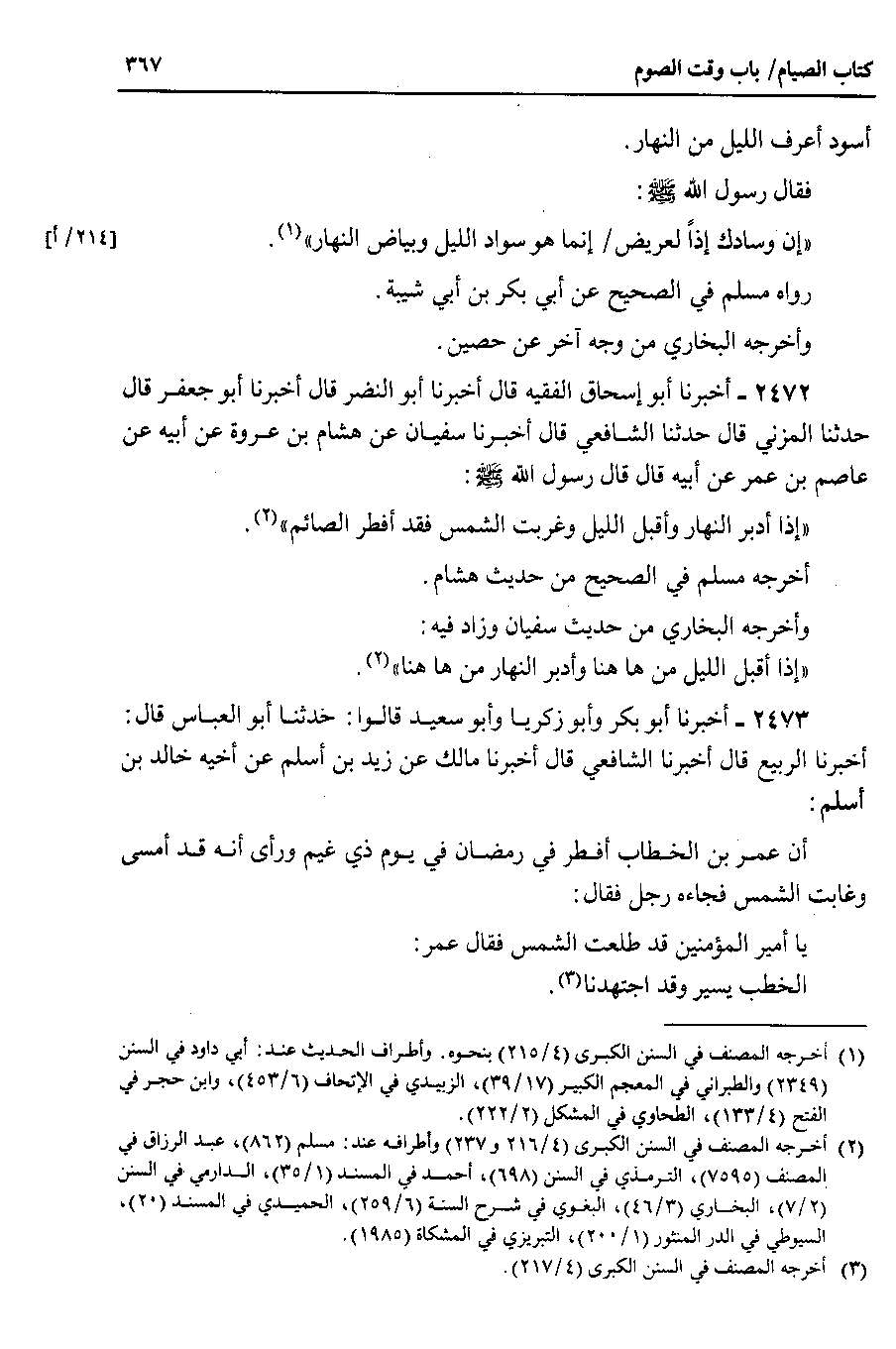 2472 - أخبرنا أبو إسحاق الفقيه قال أخبرنا أبو النضر قال أخبرنا أبو جعفر قال حدثنا المزني قال حدثنا الشافعي قال أخبرنا سفيان عن هشام بن عروة عن أبيه عن عاصم بن عمر عن أبيه قال قال رسول الله صلى الله عليه وسلم إذا أدبر النهار وأقبل الليل وغربت الشمس فقد أفطر الصائم.