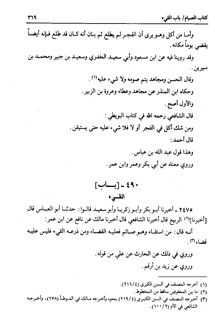 2475 - أخبرنا أبو بكر وأبو زكريا وأبو سعيد قالوا : حدثنا أبو العباس قال أخبرنا الربيع قال أخبرنا الشافعي قال أخبرنا مالك عن نافع عن ابن عمر أنه قال : من استقاء وهو صائم فعليه القضاء ومن ذرعه القيء فليس عليه قضاء.