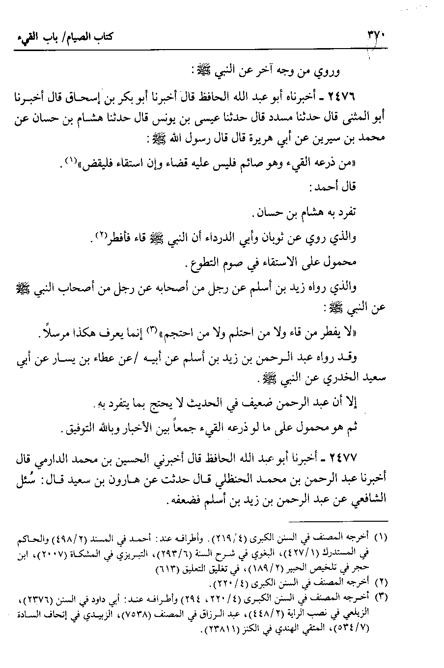 وروي من وجه آخر عن النبي صلى الله عليه وسلم 2476 - أخبرناه أبو عبد الله الحافظ قال أخبرنا أبو بكر بن إسحاق قال أخبرنا أبو المثنى قال حدثنا مسدد قال حدثنا عيسى بن يونس قال حدثنا هشام بن حسان عن محمد بن سيرين عن أبي هريرة قال قال رسول الله صلى الله عليه وسلم من ذرعه القيء وهو صائم فليس عليه قضاء وإن استقاء فليقض.