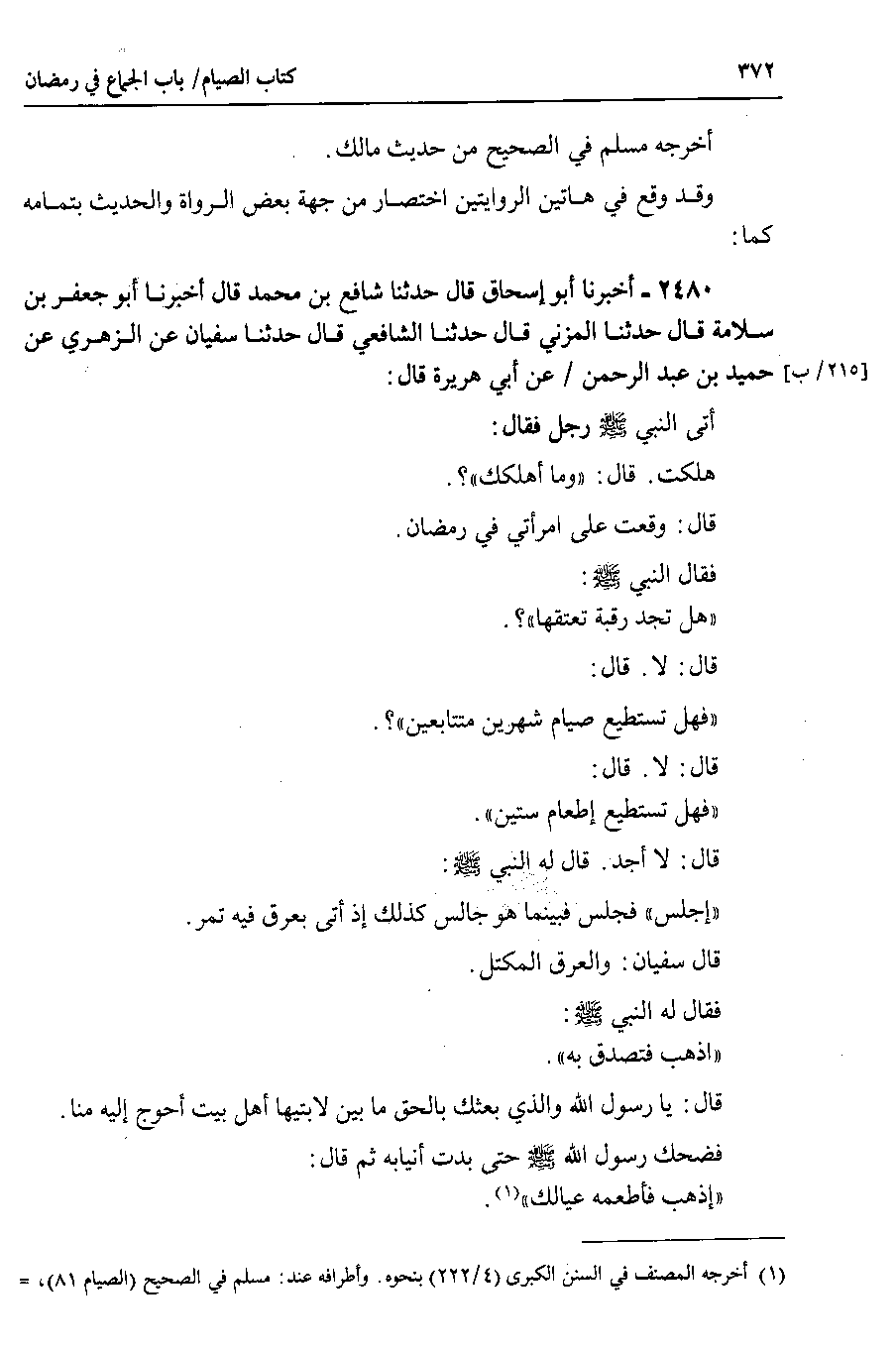 وقد وقع في هاتين الروايتين اختصار من جهة بعض الرواة والحديث بتمامه كما 2480 - أخبرنا أبو إسحاق قال حدثنا شافع بن محمد قال أخبرنا أبو جعفر بن سلامة قال حدثنا المزني قال حدثنا الشافعي قال حدثنا سفيان عن الزهري عن حميد بن عبد الرحمن عن أبي هريرة قال أتى النبي صلى الله عليه وسلم رجل فقال هلكت . قال : وما أهلكك ؟.