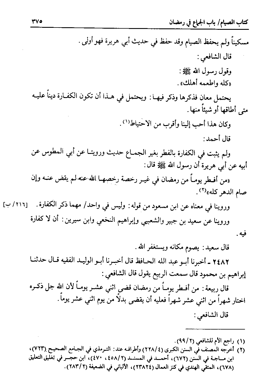2482 - أخبرنا أبو عبد الله الحافظ قال أخبرنا أبو الوليد الفقيه قال حدثنا إبراهيم بن محمود قال سمعت الربيع يقول قال الشافعي قال ربيعة : من أفطر يوماً من رمضان قضى اثني عشر يوماً لأن الله جل ذكره اختار شهراً من اثني عشر شهراً فعليه أن يقضى بدلاً من يوم اثني عشر يوماً.