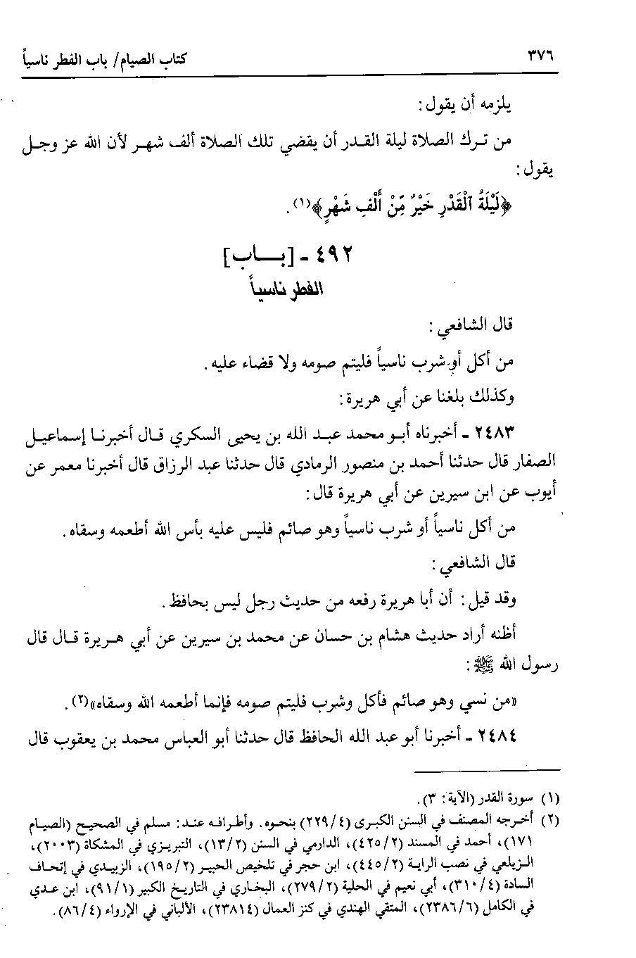 وكذلك بلغنا عن أبي هريرة 2483 - أخبرناه أبو محمد عبد الله بن يحيى السكري قال أخبرنا إسماعيل الصفار قال حدثنا أحمد بن منصور الرمادي قال حدثنا عبد الرزاق قال أخبرنا معمر عن أيوب عن ابن سيرين عن أبي هريرة قال من أكل ناسياً أو شرب ناسياً وهو صائم فليس عليه بأس الله أطعمه وسقاه.