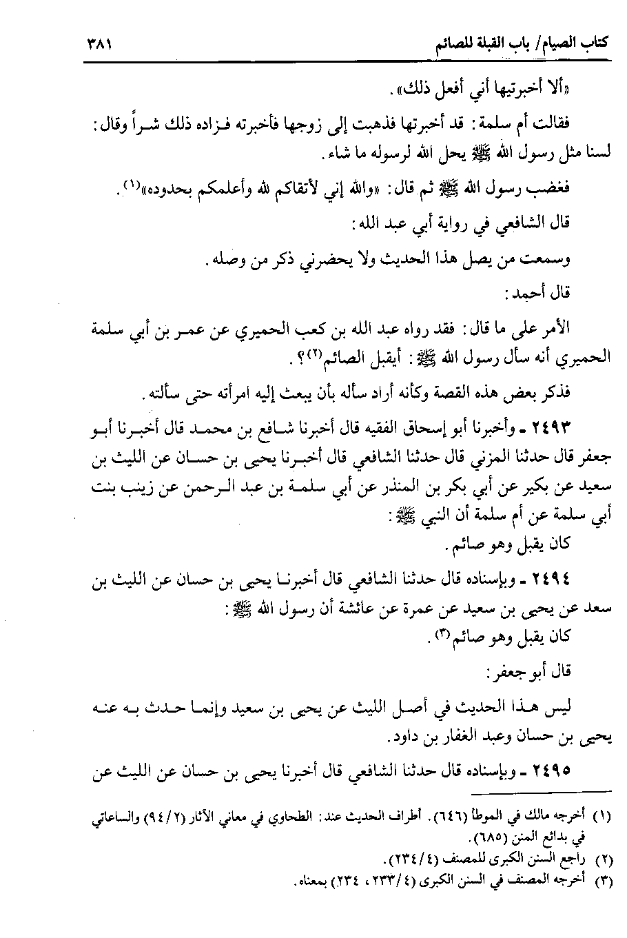 2494 - وبإسناده قال حدثنا الشافعي قال أخبرنا يحيى بن حسان عن الليث بن سعد عن يحيى بن سعيد عن عمرة عن عائشة أن رسول الله صلى الله عليه وسلم كان يقبل وهو صائم.