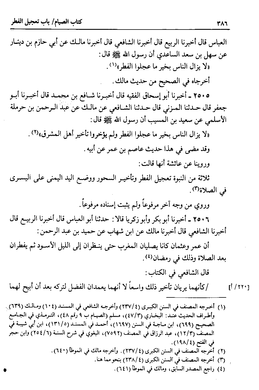 2506 - أخبرنا أبو بكر وأبو زكريا قالا : حدثنا أبو العباس قال أخبرنا الربيع قال أخبرنا الشافعي قال أخبرنا مالك عن ابن شهاب عن حميد بن عبد الرحمن أن عمر وعثمان كانا يصليان المغرب حتى ينظران إلى الليل الأسود ثم يفطران بعد الصلاة وذلك في رمضان.