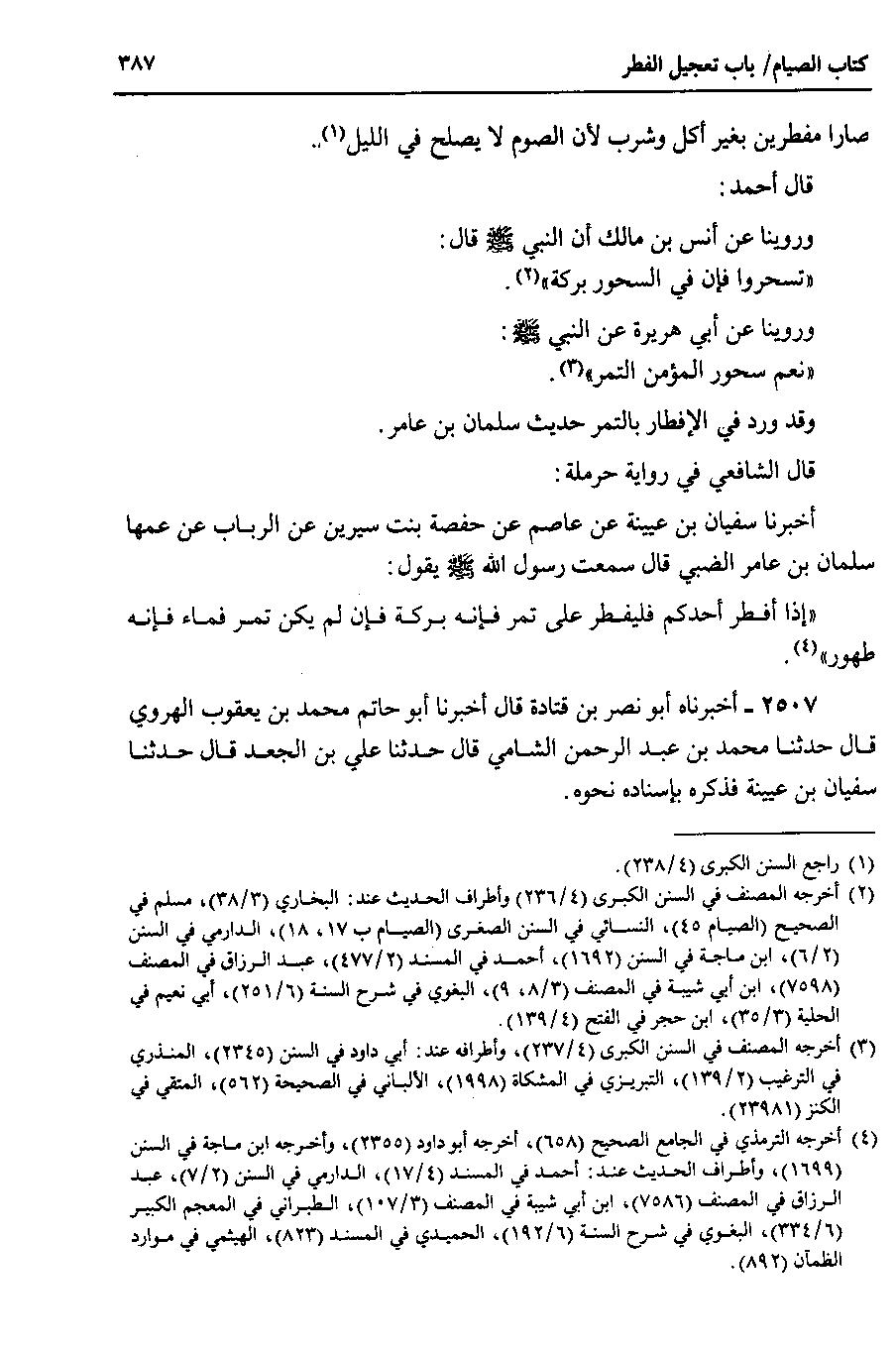قال أحمد وروينا عن أنس بن مالك أن النبي صلى الله عليه وسلم قال تسحروا فإن في السحور بركة.