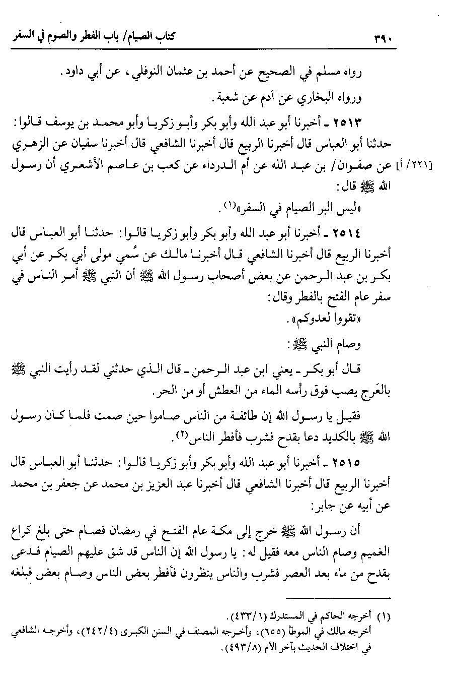 2513 - أخبرنا أبو عبد الله وأبو بكر وأبو زكريا وأبو محمد بن يوسف قالوا حدثنا أبو العباس قال أخبرنا الربيع قال أخبرنا الشافعي قال أخبرنا سفيان عن الزهري عن صفوان بن عبد الله عن أم الدرداء عن كعب بن عاصم الأشعري أن رسول الله صلى الله عليه وسلم قال : ليس البر الصيام في السفر.