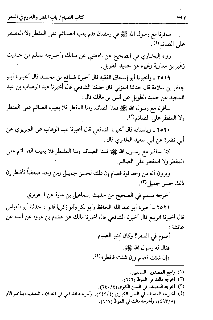 2521 - أخبرنا أبو عبد الله الحافظ وأبو بكر وأبو زكريا قالوا : حدثنا أبو العباس قال أخبرنا الربيع قال أخبرنا الشافعي قال أخبرنا مالك عن هشام بن عروة عن أبيه عن عائشة أصوم في السفر ؟ وكان كثير الصيام.