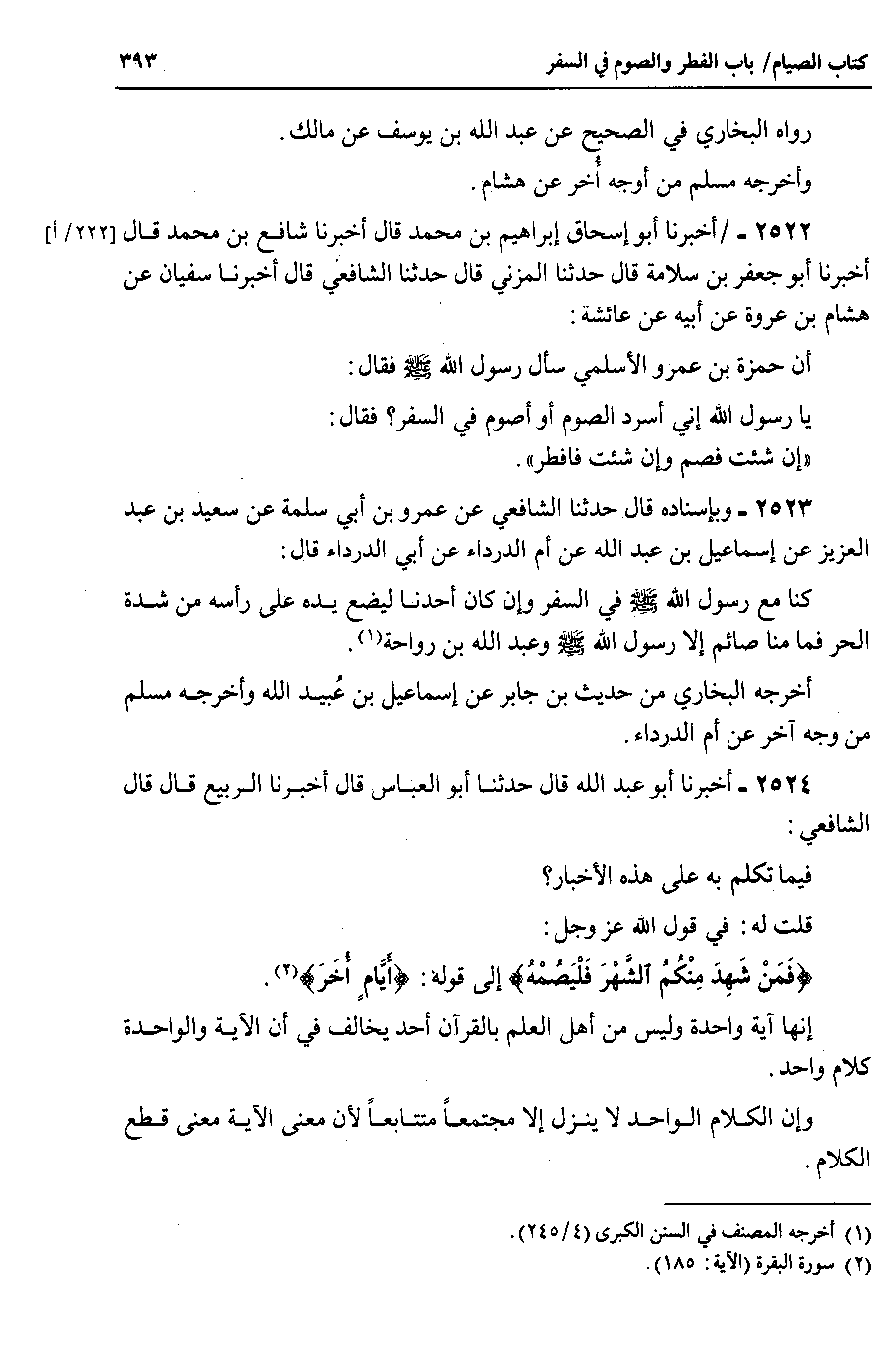 2522 - أخبرنا أبو إسحاق إبراهيم بن محمد قال أخبرنا شافع بن محمد قال أخبرنا أبو جعفر بن سلامة قال حدثنا المزني قال حدثنا الشافعي قال أخبرنا سفيان عن هشام بن عروة عن أبيه عن عائشة أن حمزة بن عمرو الأسلمي سأل رسول الله صلى الله عليه وسلم فقال يا رسول الله إني أسرد الصوم أو أصوم في السفر ؟ فقال إن شئت فصم وإن شئت فأفطر.