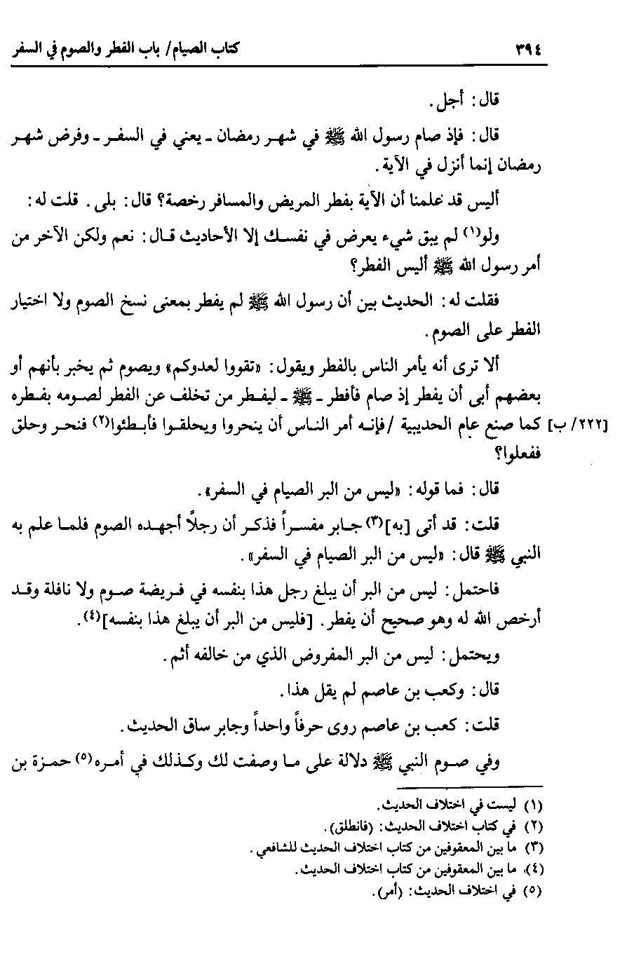 أليس قد علمنا أن الآية بفطر المريض والمسافر رخصة ؟ قال : بلى . قلت له ولو لم يبق شيء يعرض في نفسك إلا الأحاديث قال : نعم ولكن الآخر من أمر رسول الله صلى الله عليه وسلم أليس الفطر ؟ فقلت له : الحديث بين أن رسول الله صلى الله عليه وسلم لم يفطر بمعنى نسخ الصوم ولا اختيار الفطر على الصوم.