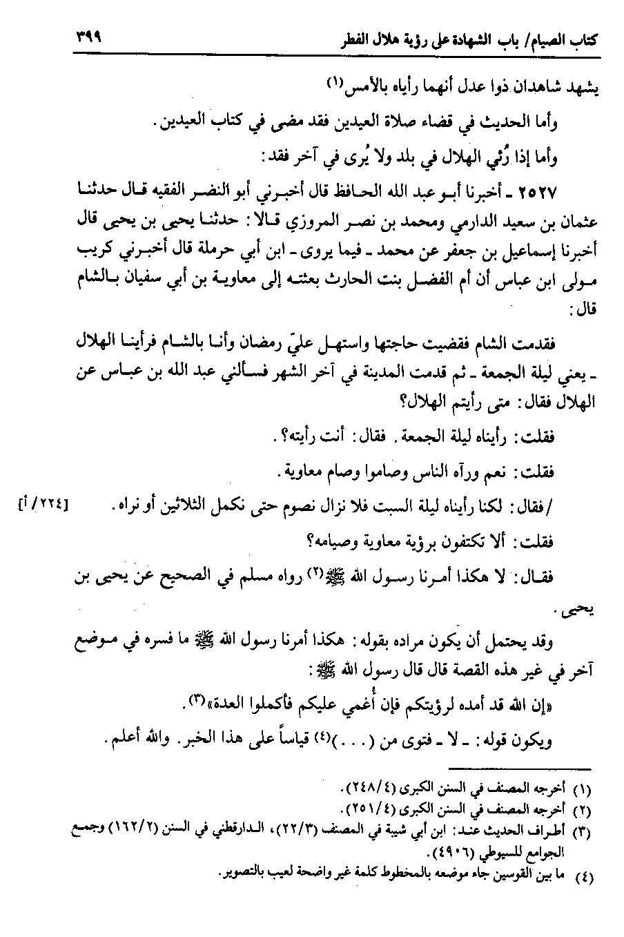 وأما إذا رئي الهلال في بلد ولا يرى في آخر فقد 2527 - أخبرنا أبو عبد الله الحافظ قال أخبرني أبو النضر الفقيه قال حدثنا عثمان بن سعيد الدارمي ومحمد بن نصر المروزي قالا : حدثنا يحيى بن يحيى قال أخبرنا إسماعيل بن جعفر عن محمد _ فيما يروى _ ابن أبي حرملة قال أخبرني كريب مولى ابن عباس أن أم الفضل بنت الحارث بعثته إلى معاوية بن أبي سفيان بالشام قال فقدمت الشام فقضيت حاجتها واستهل علي رمضان وأنا بالشام فرأينا الهلال _ يعني ليلة الجمعة _ ثم قدمت المدينة في آخر الشهر فسألني عبد الله بن عباس عن الهلال فقال : متى رأيتم الهلال ؟ فقلت : رأيناه ليلة الجمعة . فقال : أنت رأيته ؟.