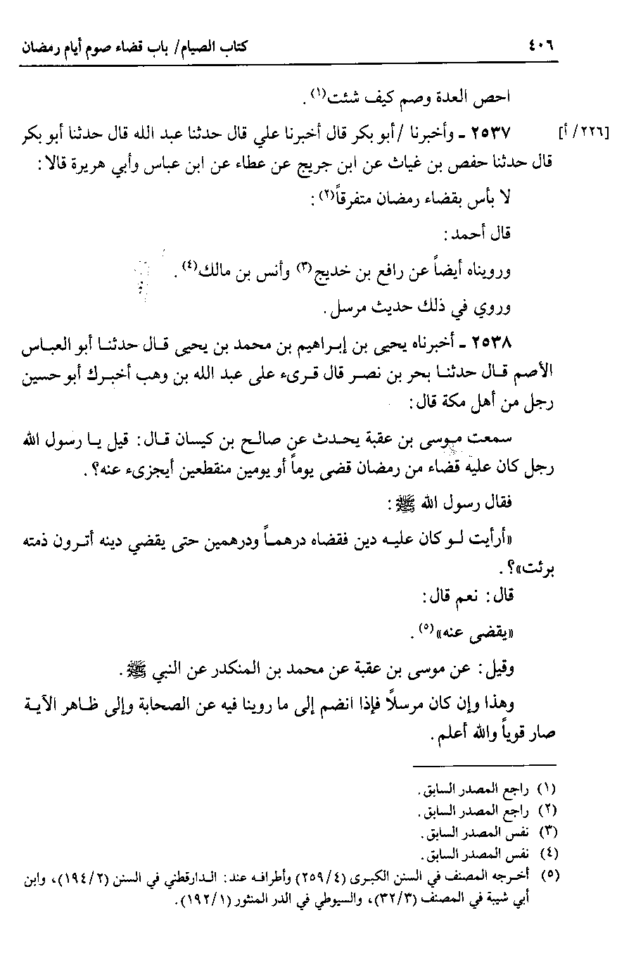 2538 - أخبرناه يحيى بن إبراهيم بن محمد بن يحيى قال حدثنا أبو العباس الأصم قال حدثنا بحر بن نصر قال قرئ على عبد الله بن وهب أخبرك أبو حسين رجل من أهل مكة قال سمعت موسى بن عقبة يحدث عن صالح بن كيسان قال : قيل يا رسول الله رجل كان عليه قضاء من رمضان قضى يوماً أو يومين منقطعين أيجزئ عنه ؟.