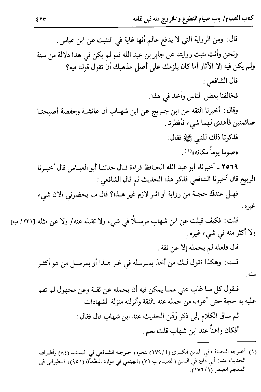2569 - أخبرناه أبو عبد الله الحافظ قراءة قال حدثنا أبو العباس قال أخبرنا الربيع قال أخبرنا الشافعي فذكر هذا الحديث ثم قال الشافعي فهل عندك حجة من رواية أو أثر لازم غير هذا ؟ قال ما يحضرني الآن شيء غيره.