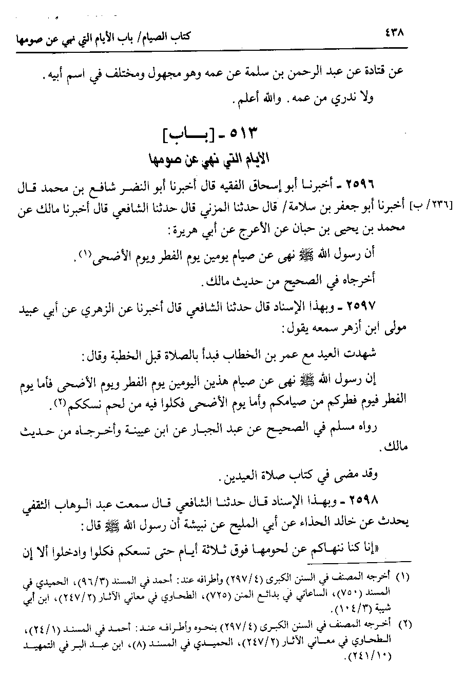2596 - أخبرنا أبو إسحاق الفقيه قال أخبرنا أبو النضر شافع بن محمد قال أخبرنا أبو جعفر بن سلامة قال حدثنا المزني قال حدثنا الشافعي قال أخبرنا مالك عن محمد بن يحيى بن حبان عن الأعرج عن أبي هريرة أن رسول الله صلى الله عليه وسلم نهى عن صيام يومين يوم الفطر ويوم الأضحى.