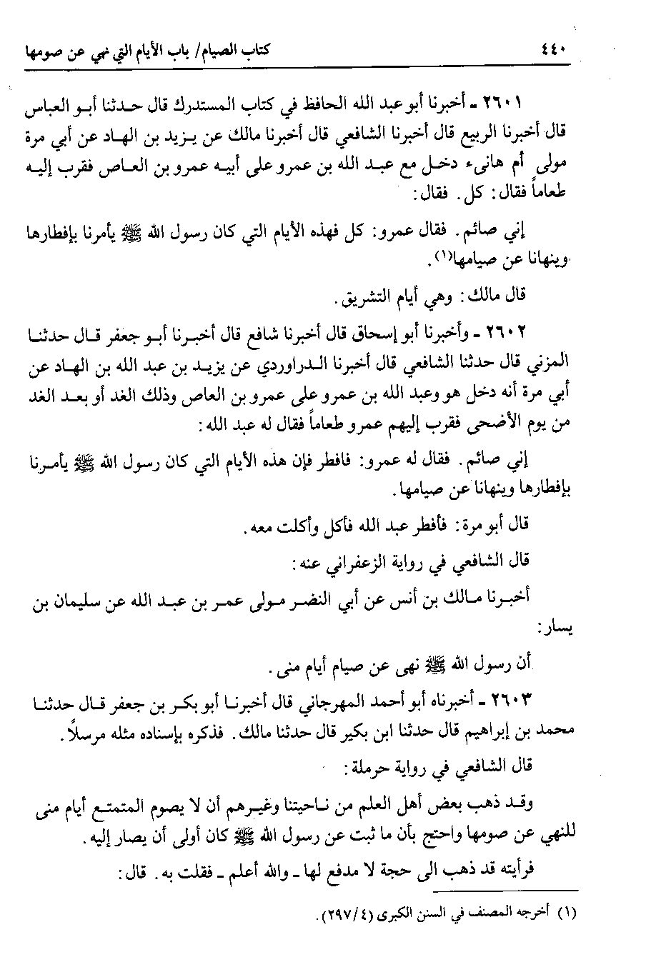 2602 - وأخبرنا أبو إسحاق قال أخبرنا شافع قال أخبرنا أبو جعفر قال حدثنا المزني قال حدثنا الشافعي قال أخبرنا الدراوردي عن يزيد بن عبد الله بن الهاد عن أبي مرة أنه دخل هو وعبد الله بن عمرو على عمرو بن العاص وذلك الغد أو بعد الغد من يوم الأضحى فقرب إليهم عمرو طعاماً فقال له عبد الله إني صائم . فقال له عمرو : فافطر فإن هذه الأيام التي كان رسول الله صلى الله عليه وسلم يأمرنا بإفطارها وينهانا عن صيامها.