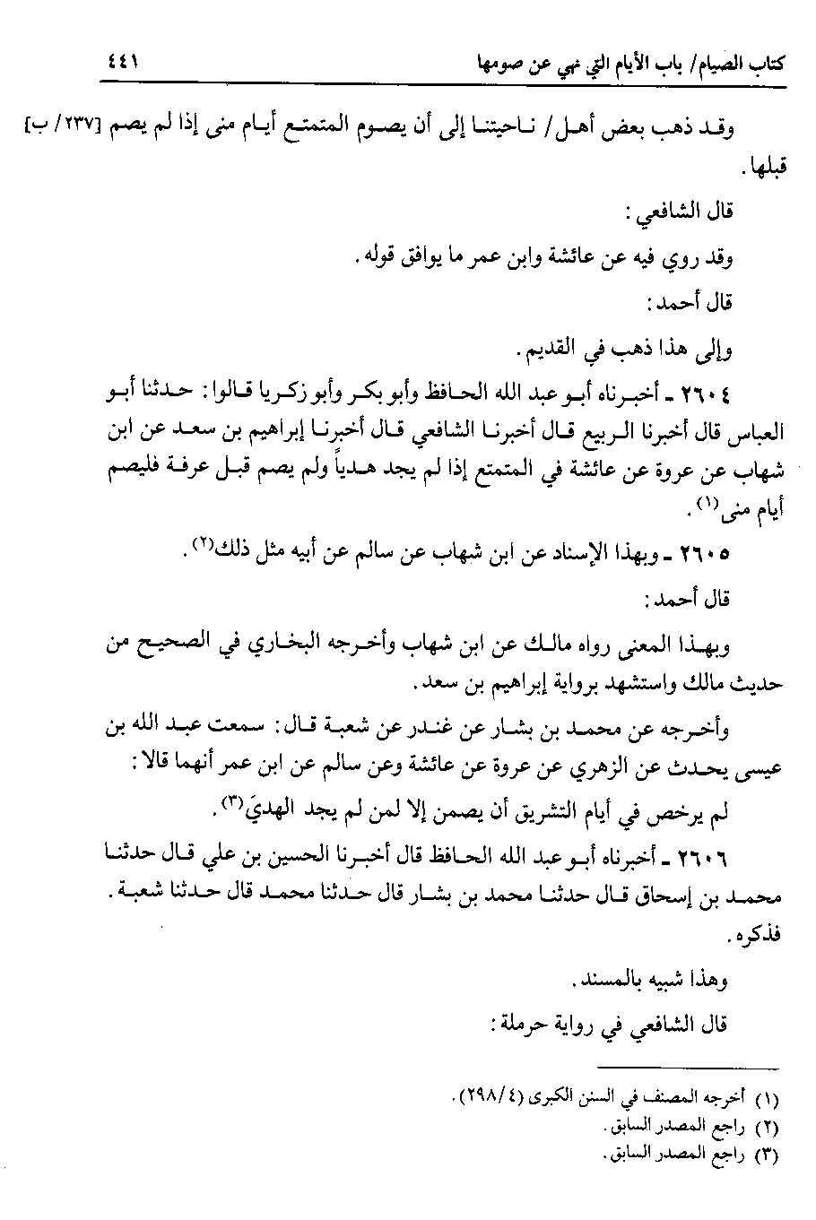 2604 - أخبرناه أبو عبد الله الحافظ وأبو بكر وأبو زكريا قالوا : حدثنا أبو العباس قال أخبرنا الربيع قال أخبرنا الشافعي قال أخبرنا إبراهيم بن سعد عن ابن شهاب عن عروة عن عائشة في المتمتع إذا لم يجد هدياً ولم يصم قبل عرفة فليصم أيام منى.