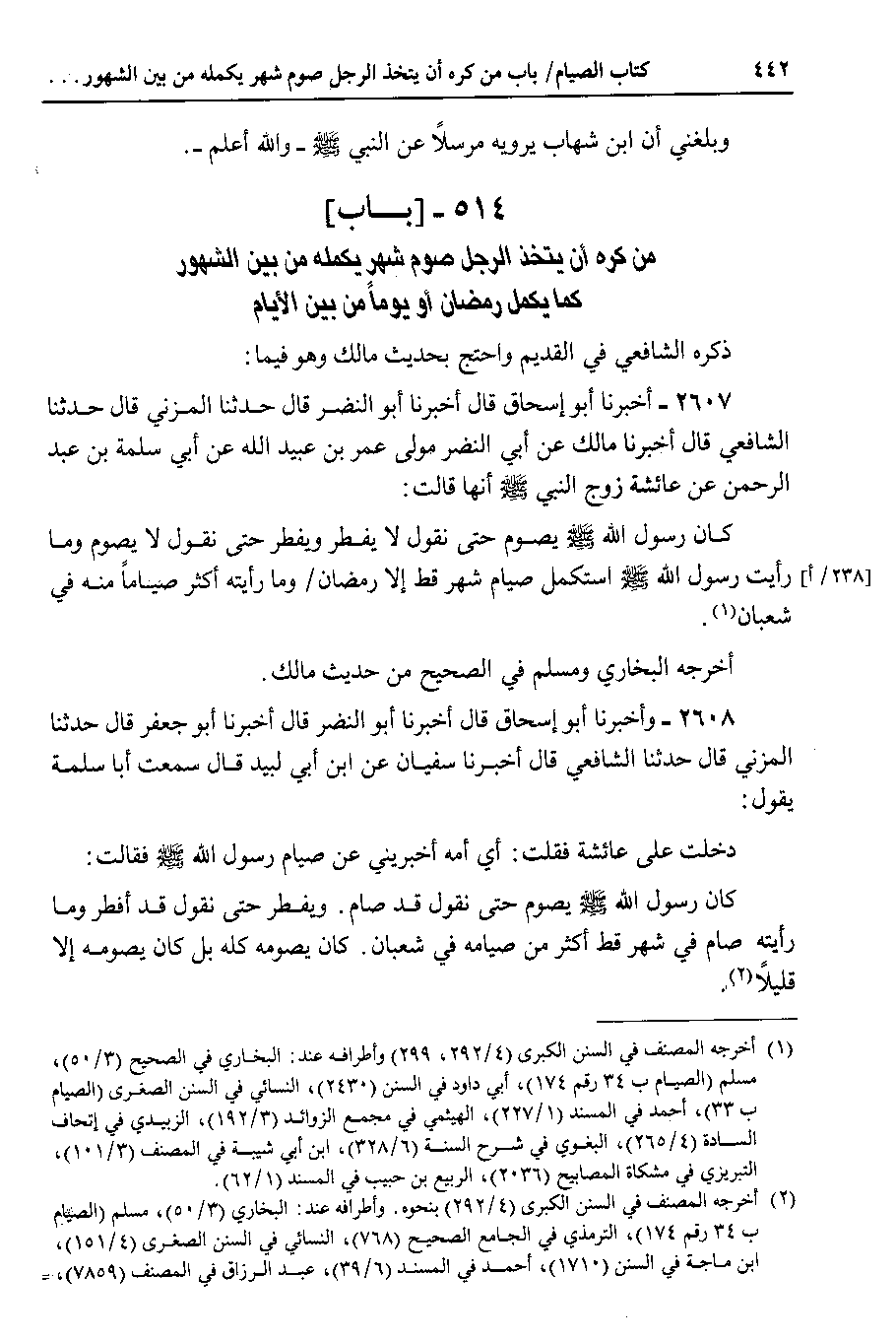 ذكره الشافعي في القديم واحتج بحديث مالك وهو فيما 2607 - أخبرنا أبو إسحاق قال أخبرنا أبو النضر قال حدثنا المزني قال حدثنا الشافعي قال أخبرنا مالك عن أبي النضر مولى عمر بن عبيد الله عن أبي سلمة بن عبد الرحمن عن عائشة زوج النبي صلى الله عليه وسلم أنها قالت كان رسول الله صلى الله عليه وسلم يصوم حتى نقول لا يفطر ويفطر حتى نقول لا يصوم وما رأيت رسول الله صلى الله عليه وسلم استكمل صيام شهر قط إلا رمضان وما رأيته أكثر صياماً منه في شعبان.