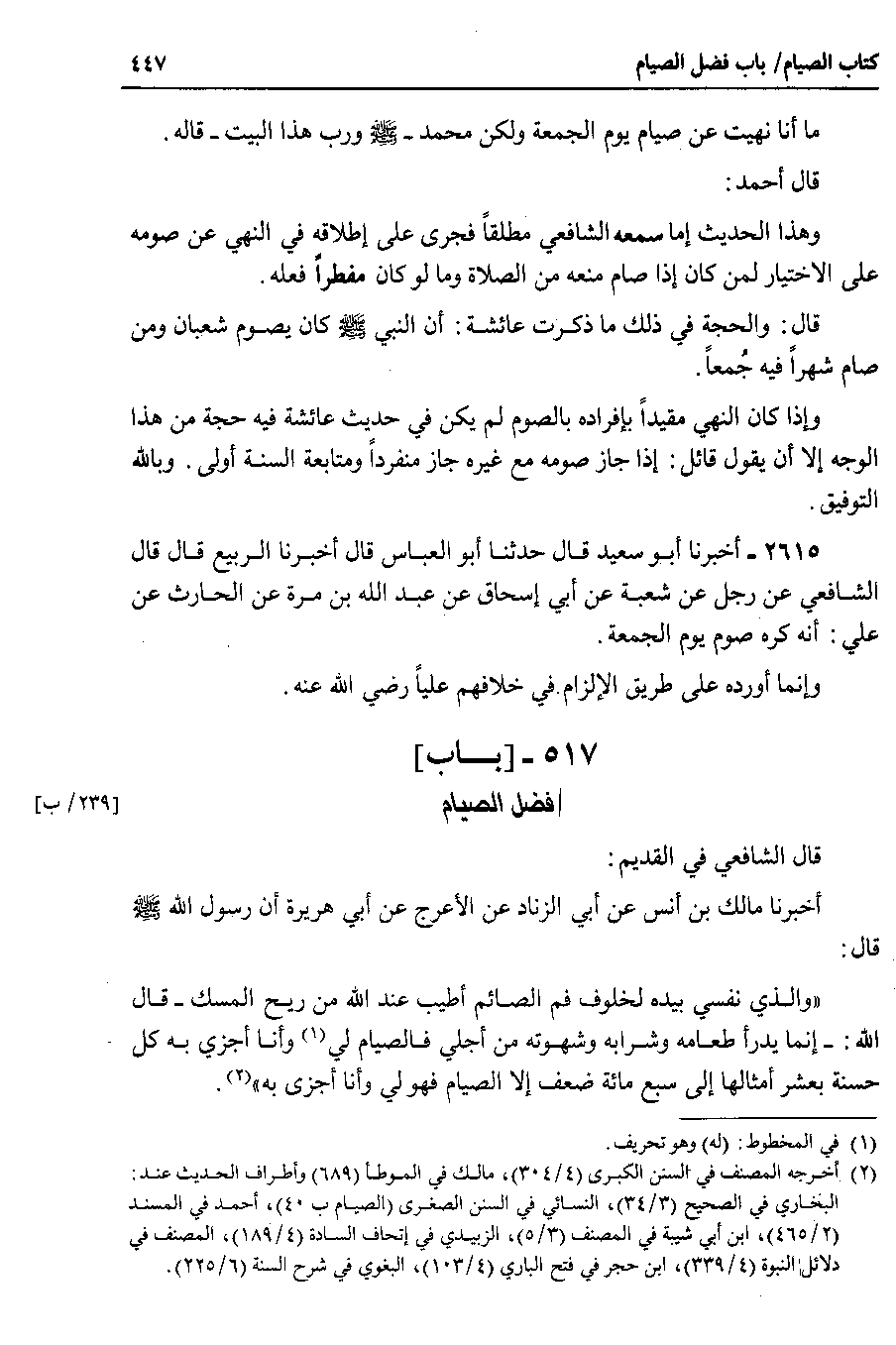 قال الشافعي في القديم أخبرنا مالك بن أنس عن أبي الزناد عن الأعرج عن أبي هريرة أن رسول الله صلى الله عليه وسلم قال والذي نفسي بيده لخلوف فم الصائم أطيب عند الله من ريح المسك _ قال الله : _ إنما يدرأ طعامه وشرابه وشهوته من أجلي فالصيام لي وأنا أجزي به كل حسنة بعشر أمثالها إلى سبع مِئَة ضعف إلا الصيام فهو لي وأنا أجزى به.