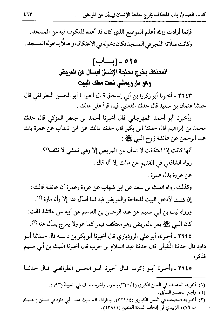 525 - باب ) ( المعتكف يخرج لحاجة الإنسان فيسأل عن المريض وهو مار ويمشي تحت سقف البيت