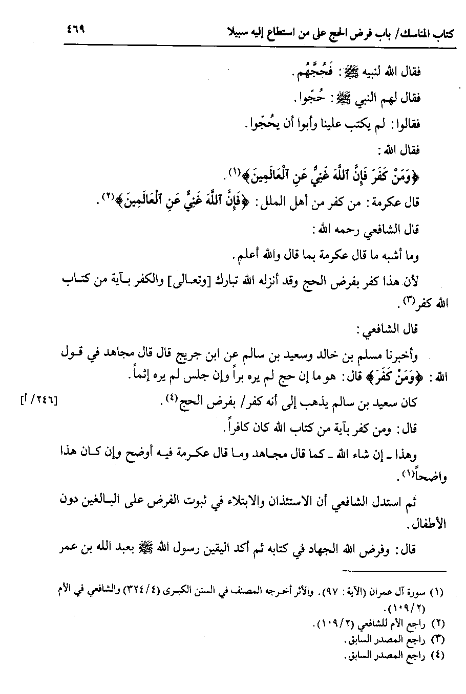 قال الشافعي وأخبرنا مسلم بن خالد وسعيد بن سالم عن ابن جريج قال قال مجاهد في قول الله : {ومن كفر} قال : هو ما إن حج لم يره براً وإن جلس لم يره إثماً.