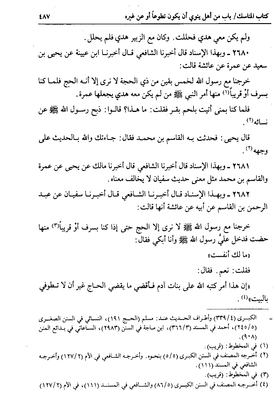 2682 - وبهذا الإسناد قال أخبرنا الشافعي قال أخبرنا سفيان عن عبد الرحمن بن القاسم عن أبيه عن عائشة أنها قالت خرجنا مع رسول الله صلى الله عليه وسلم لا نرى إلا الحج حتى إذا كنا بسرف أو قريباً منها حضت فدخل علي رسول الله صلى الله عليه وسلم وأنا أبكي فقال ما لك أنفست.