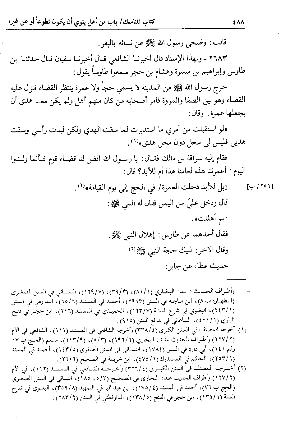 2683 - وبهذا الإسناد قال أخبرنا الشافعي قال أخبرنا سفيان قال حدثنا ابن طاووس وإبراهيم بن ميسرة وهشام بن حجر سمعوا طاوساً يقول خرج رسول الله صلى الله عليه وسلم من المدينة لا يسمي حجاً ولا عمرة ينتظر القضاء فنزل عليه القضاء وهو بين الصفا والمروة فأمر أصحابه من كان منهم أهل ولم يكن معه هدي أن يجعلها عمرة . وقال لو استقبلت من أمري ما استدبرت لما سقت الهدي ولكن لبدت رأسي وسقت هديي فليس لي محل دون محل هدي.