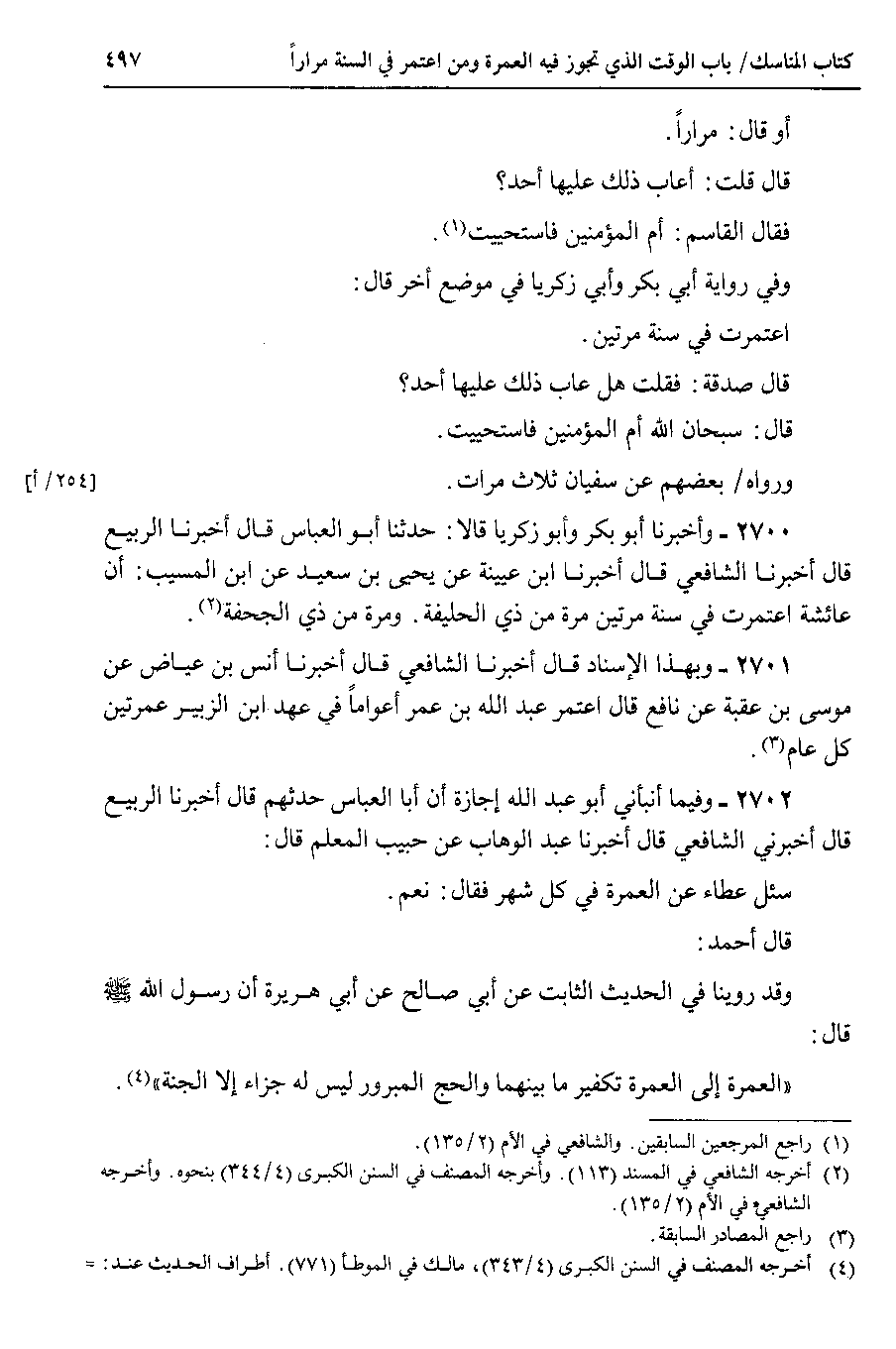 2700 - وأخبرنا أبو بكر وأبو زكريا قالا : حدثنا أبو العباس قال أخبرنا الربيع قال أخبرنا الشافعي قال أخبرنا ابن عيينة عن يحيى بن سعيد عن ابن المسيب : أن عائشة اعتمرت في سنة مرتين مرة من ذي الحليفة . ومرة من ذي الجحفة.