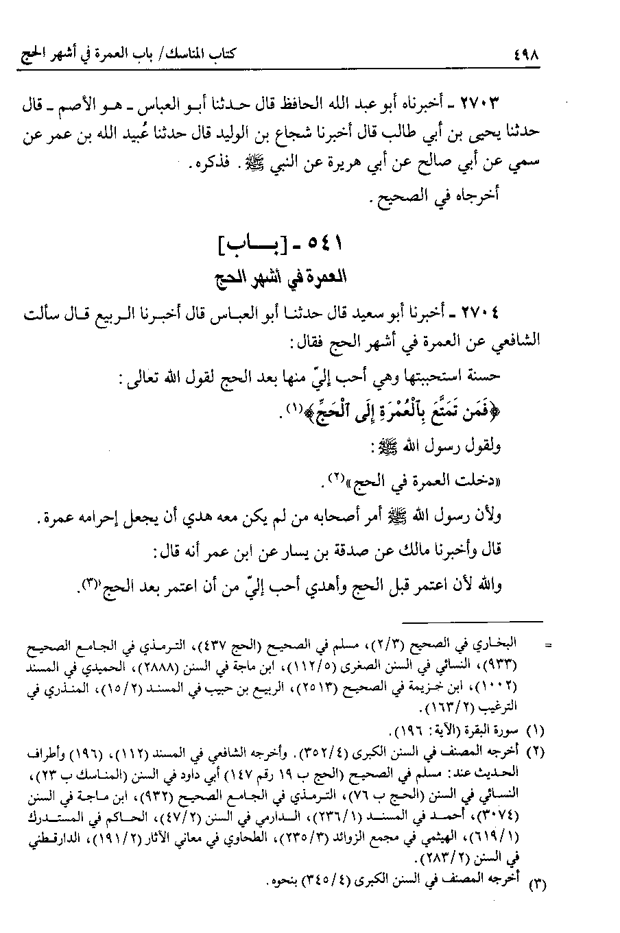 2704 - أخبرنا أبو سعيد قال حدثنا أبو العباس قال أخبرنا الربيع قال سألت الشافعي عن العمرة في أشهر الحج فقال حسنة استحببتها وهي أحب إلي منها بعد الحج لقول الله تعالى {فمن تمتع بالعمرة إلى الحج}.