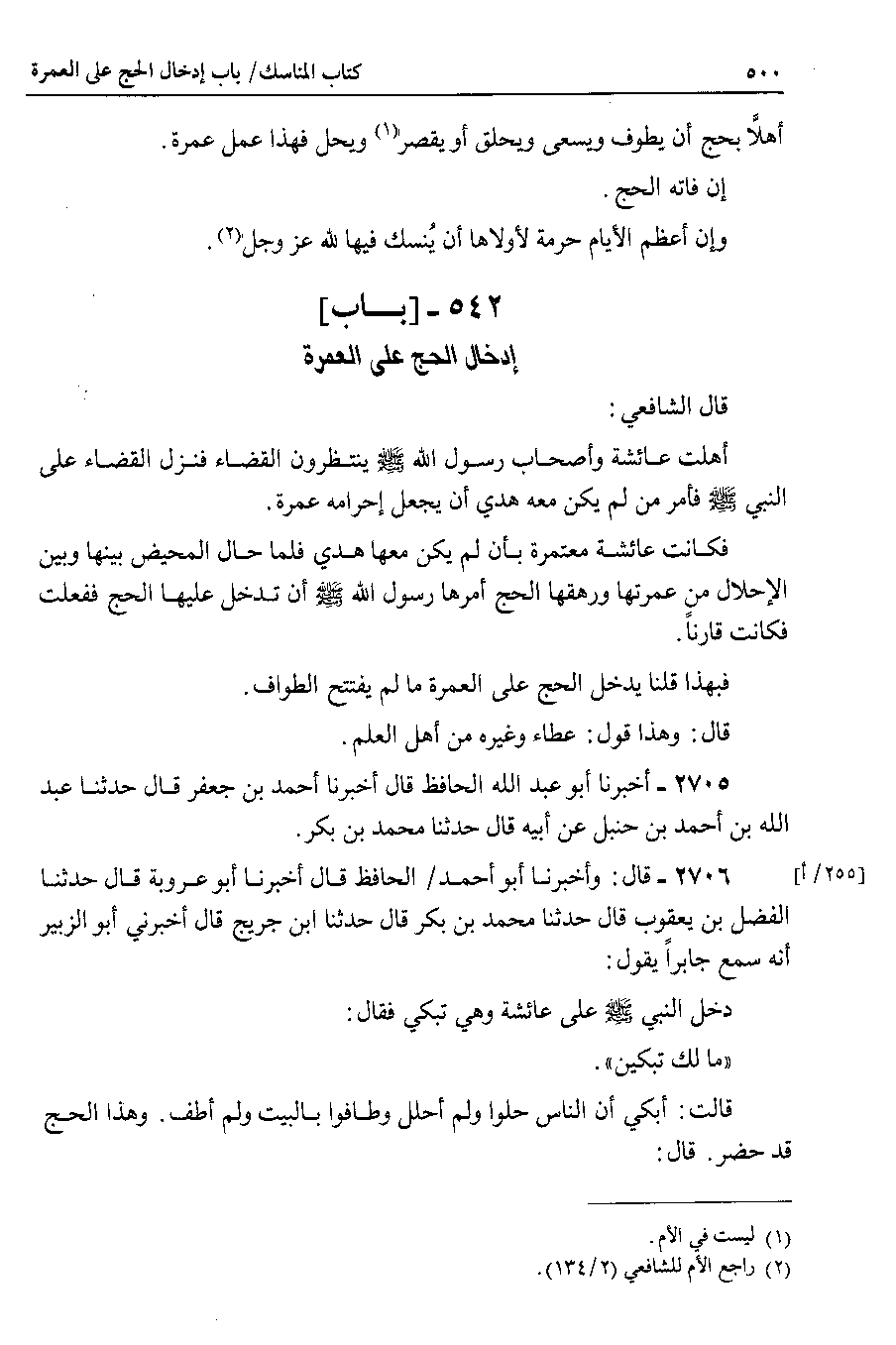 قال الشافعي أهلت عائشة وأصحاب رسول الله صلى الله عليه وسلم ينتظرون القضاء فنزل القضاء على النبي صلى الله عليه وسلم فأمر من لم يكن معه هدي أن يجعل إحرامه عمرة.