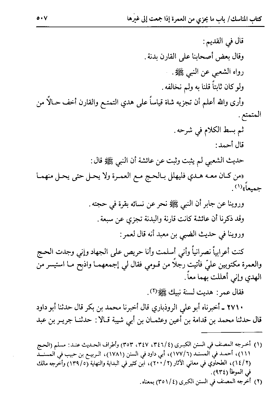 قال أحمد حديث الشعبي لم يثبت وثبت عن عائشة أن النبي صلى الله عليه وسلم قال من كان معه هدي فليهلل بالحج مع العمرة ولا يحل حتى يحل منهما جميعاً.