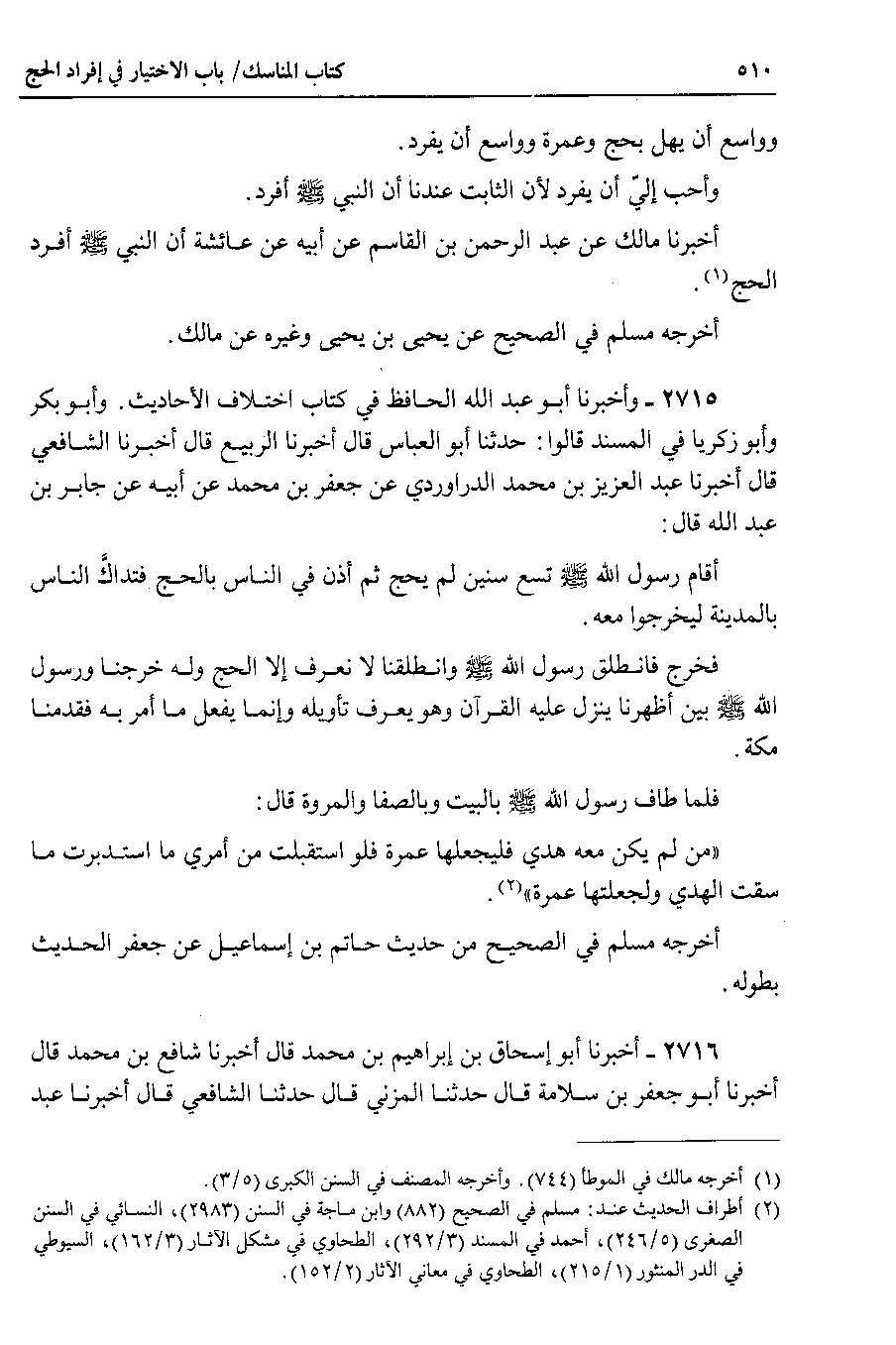 أَخْبَرَنَا مالك عن عبد الرحمن بن القاسم عن أبيه عن عائشة أن النبي صلى الله عليه وسلم أفرد الحج.