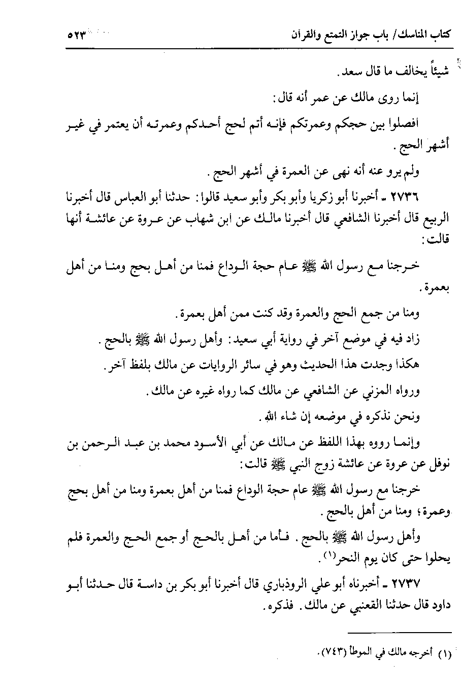 2736 - أخبرنا أبو زكريا وأبو بكر وأبو سعيد قالوا Y حدثنا أبو العباس قال أخبرنا الربيع قال أخبرنا الشافعي قال أخبرنا مالك عن ابن شهاب عن عروة عن عائشة أنها قالت خرجنا مع رسول الله A عام حجة الوداع فمنا من أهل بحج ومنا من أهل بعمرة.