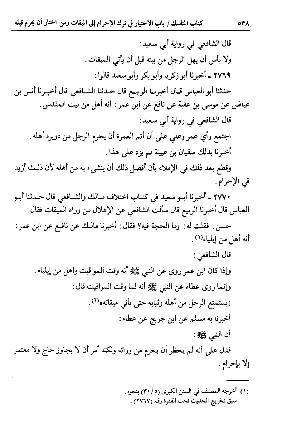2769 - أخبرنا أبو زكريا وأبو بكر وأبو سعيد قالوا حدثنا أبو العباس قال أخبرنا الربيع قال حدثنا الشافعي قال أخبرنا أنس بن عياض عن موسى بن عقبة عن نافع عن ابن عمر : أنه أهل من بيت المقدس.