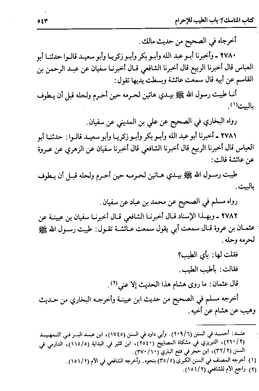 2782 - وبهذا الإسناد قال أخبرنا الشافعي قال أخبرنا سفيان بن عيينة عن عثمان بن عروة قال سمعت أبي يقول سمعت عائشة تقول : طيبت رسول الله صلى الله عليه وسلم لحرمه وحله.