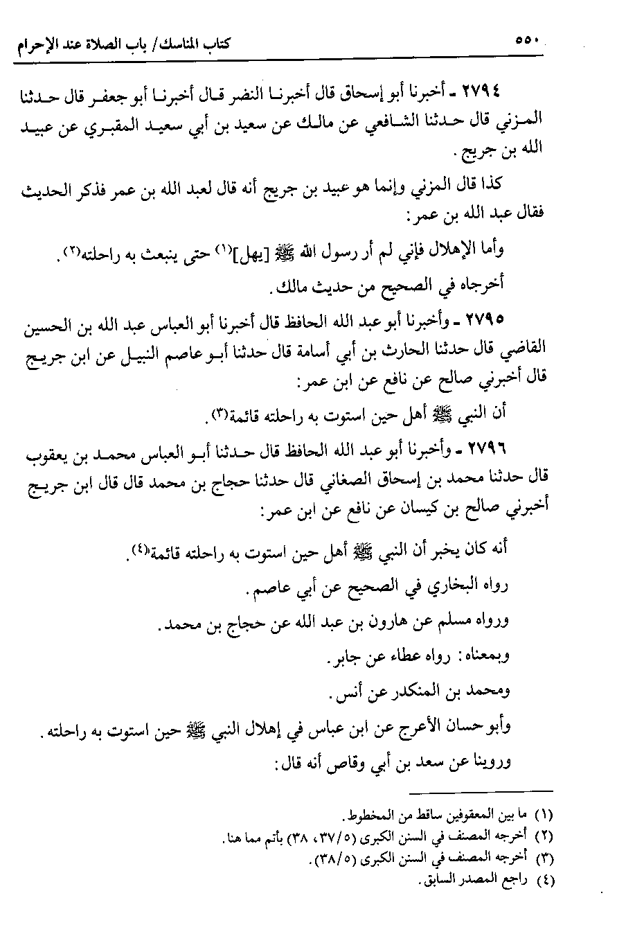 2796 - وأخبرنا أبو عبد الله الحافظ قال حدثنا أبو العباس محمد بن يعقوب قال حدثنا محمد بن إسحاق الصغاني قال حدثنا حجاج بن محمد قال قال ابن جريج أخبرني صالح بن كيسان عن نافع عن ابن عمر أنه كان يخبر أن النبي صلى الله عليه وسلم أهل حين استوت به راحلته قائمة.