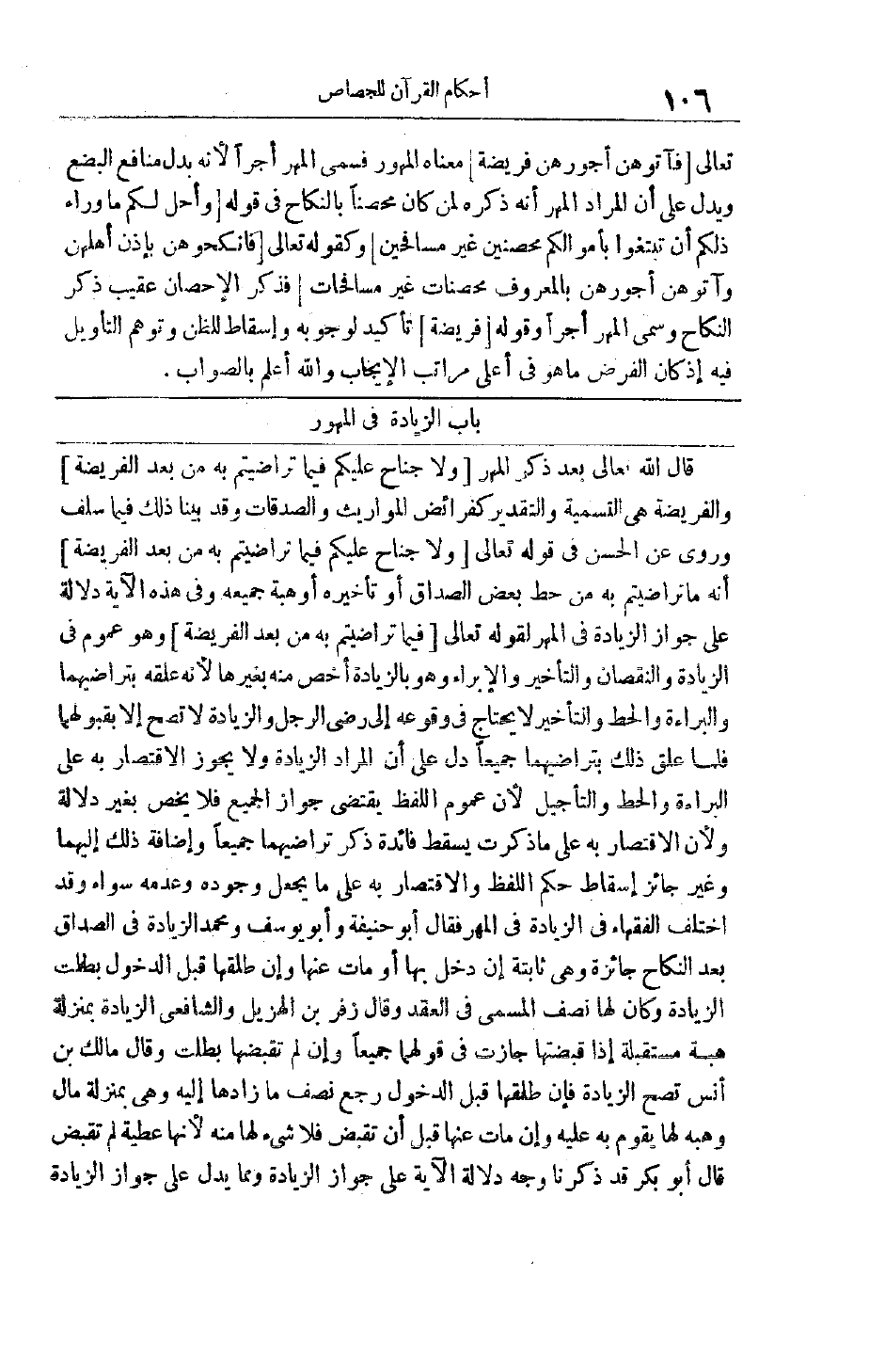 قَالَ اللَّهُ تَعَالَى بَعْدَ ذِكْرِ الْمَهْرِ وَلا جُناحَ عَلَيْكُمْ فِيما تَراضَيْتُمْ بِهِ مِنْ بَعْدِ الْفَرِيضَةِ والفريضة هي التَّسْمِيَةُ وَالتَّقْدِيرُ كَفَرَائِضِ الْمَوَارِيثِ وَالصَّدَقَاتِ وَقَدْ بَيَّنَّا ذَلِكَ فِيمَا سَلَفَ وَرُوِيَ عَنْ الْحَسَنِ فِي قَوْله تَعَالَى وَلا جُناحَ عَلَيْكُمْ فِيما تَراضَيْتُمْ بِهِ مِنْ بَعْدِ الْفَرِيضَةِ أَنَّهُ مَا تَرَاضَيْتُمْ بِهِ مِنْ حَطِّ بَعْضِ الصَّدَاقِ أَوْ تَأْخِيرِهِ أَوْ هِبَةِ جَمِيعِهِ وَفِي هَذِهِ الْآيَةِ دَلَالَةٌ عَلَى جَوَازِ الزِّيَادَةِ فِي الْمَهْرِ لِقَوْلِهِ تَعَالَى فِيما تَراضَيْتُمْ بِهِ مِنْ بَعْدِ الْفَرِيضَةِ وَهُوَ عُمُومٌ فِي الزِّيَادَةِ وَالنُّقْصَانِ وَالتَّأْخِيرِ وَالْإِبْرَاءِ وَهُوَ بِالزِّيَادَةِ أَخَصُّ مِنْهُ بِغَيْرِهَا لِأَنَّهُ عَلَّقَهُ بِتَرَاضِيهِمَا وَالْبَرَاءَةُ وَالْحَطُّ وَالتَّأْخِيرُ لَا يُحْتَاجُ فِي وُقُوعِهِ إلَى رِضَى الرَّجُلِ وَالزِّيَادَةُ لَا تَصِحُّ إلَّا بِقَبُولِهِمَا فَلَمَّا عُلِّقَ ذَلِكَ بِتَرَاضِيهِمَا جَمِيعًا دَلَّ عَلَى أَنَّ الْمُرَادَ الزِّيَادَةُ وَلَا يَجُوزُ الِاقْتِصَارُ بِهِ عَلَى الْبَرَاءَةِ وَالْحَطِّ وَالتَّأْجِيلِ لِأَنَّ عُمُومَ اللَّفْظِ يَقْتَضِي جَوَازَ الْجَمِيعِ فَلَا يُخَصُّ بِغَيْرِ دَلَالَةٍ وَلِأَنَّ الِاقْتِصَارَ بِهِ عَلَى مَا ذَكَرْت يُسْقِطُ فَائِدَةَ ذِكْرِ تَرَاضِيهِمَا جَمِيعًا وَإِضَافَةِ ذَلِكَ إلَيْهِمَا وَغَيْرُ جَائِزٍ إسْقَاطُ حُكْمِ اللَّفْظِ وَالِاقْتِصَارُ بِهِ عَلَى مَا يَجْعَلُ وُجُودَهُ وَعَدَمَهُ سَوَاءً وَقَدْ اخْتَلَفَ الْفُقَهَاءُ فِي الزِّيَادَةِ فِي الْمَهْرِ فَقَالَ أَبُو حَنِيفَةَ وَأَبُو يُوسُفَ وَمُحَمَّدٌ الزِّيَادَةُ فِي الصَّدَاقِ بَعْدَ النِّكَاحِ جَائِزَةٌ وَهِيَ ثَابِتَةٌ إنْ دَخَلَ بِهَا أَوْ مَاتَ عَنْهَا وَإِنْ طَلَّقَهَا قَبْلَ الدُّخُولِ بَطَلَتْ الزِّيَادَةُ وَكَانَ لَهَا نِصْفُ الْمُسَمَّى فِي الْعَقْدِ وَقَالَ زُفَرُ بن الهزيل وَالشَّافِعِيُّ الزِّيَادَةُ بِمَنْزِلَةِ هِبَةٍ مُسْتَقْبَلَةٍ إذَا قَبَضَتْهَا جَازَتْ فِي قَوْلِهِمَا جَمِيعًا وَإِنْ لَمْ تَقْبِضْهَا بَطَلَتْ وَقَالَ مَالِكُ بْنُ أَنَسٍ تَصِحُّ الزِّيَادَةُ فَإِنْ طَلَّقَهَا قَبْلَ الدُّخُولِ رَجَعَ نِصْفُ مَا زَادَهَا إلَيْهِ وَهِيَ بِمَنْزِلَةِ مَالٍ وَهَبَهُ لَهَا يُقَوَّمُ بِهِ عَلَيْهِ وَإِنْ مَاتَ عَنْهَا قَبْلَ أَنْ تَقْبِضَ فَلَا شَيْءَ لَهَا مِنْهُ لِأَنَّهَا عَطِيَّةٌ لَمْ تُقْبَضْ قَالَ أَبُو بَكْرٍ قَدْ ذَكَرْنَا وَجْهَ دَلَالَةِ الْآيَةِ عَلَى جَوَازِ الزِّيَادَةِ وَمِمَّا يَدُلُّ عَلَى جَوَازِ الزِّيَادَةِ