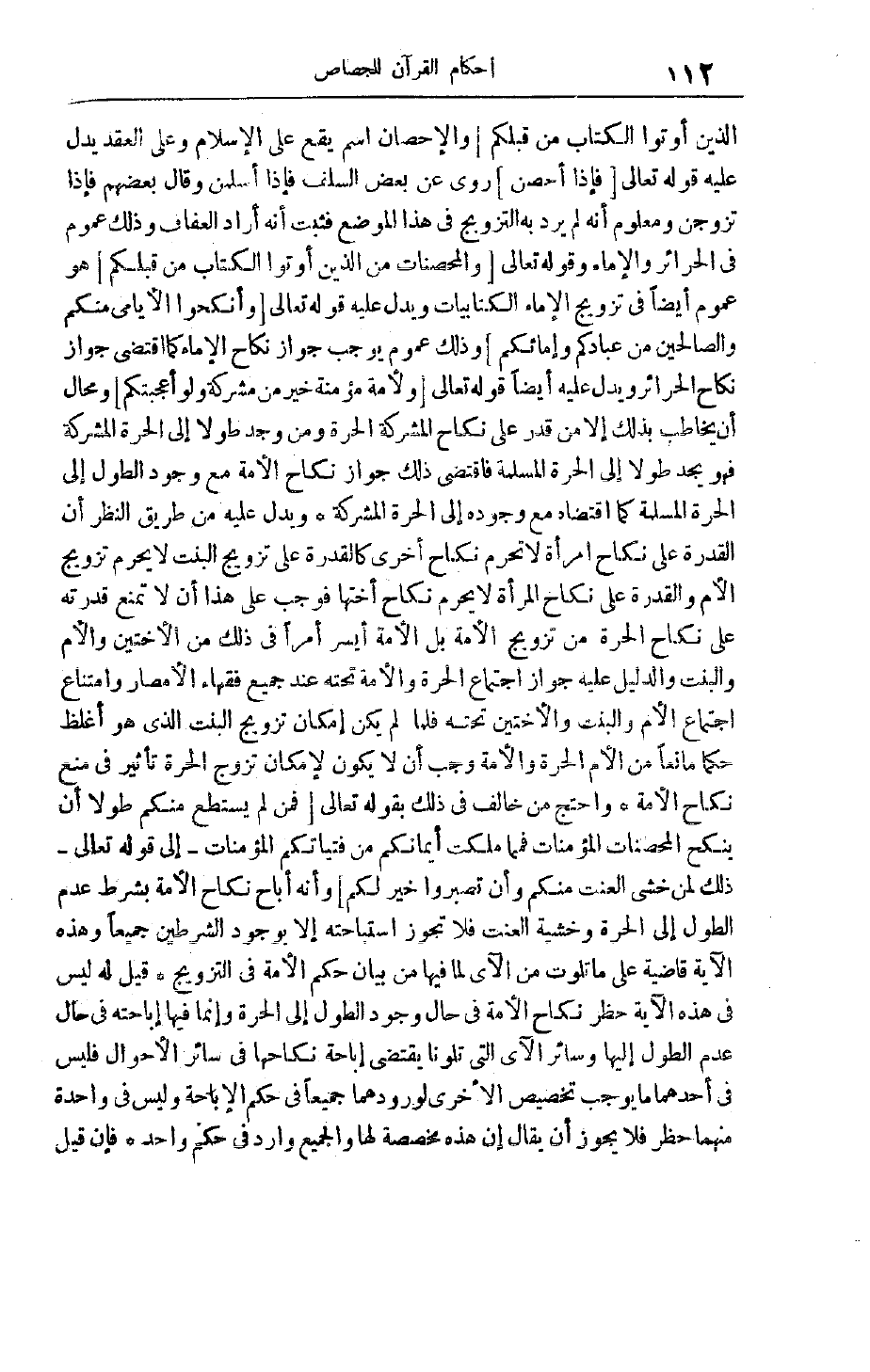 وَالْإِحْصَانُ اسْمٌ يَقَعُ عَلَى الْإِسْلَامِ وَعَلَى الْعَقْدِ يدل عليه قوله تعالى فَإِذا أُحْصِنَّ رُوِيَ عَنْ بَعْضِ السَّلَفِ فَإِذَا أَسْلَمْنَ وَقَالَ بَعْضُهُمْ فَإِذَا تَزَوَّجْنَ وَمَعْلُومٌ أَنَّهُ لَمْ يُرِدْ بِهِ التَّزْوِيجَ فِي هَذَا الْمَوْضِعِ فَثَبَتَ أَنَّهُ أَرَادَ الْعَفَافَ وَذَلِكَ عُمُومٌ فِي الْحَرَائِرِ وَالْإِمَاءِ وقَوْله تَعَالَى وَالْمُحْصَناتُ مِنَ الَّذِينَ أُوتُوا الْكِتابَ مِنْ قَبْلِكُمْ هو عموم أيضا في تزويج الإماء الكتابيات ويدل عليه قَوْله تَعَالَى وَأَنْكِحُوا الْأَيامى مِنْكُمْ وَالصَّالِحِينَ مِنْ عِبادِكُمْ وَإِمائِكُمْ وَذَلِكَ عُمُومٌ يُوجِبُ جَوَازَ نِكَاحِ الْإِمَاءِ كَمَا اقْتَضَى جَوَازَ نِكَاحِ الْحَرَائِرِ وَيَدُلُّ عَلَيْهِ أَيْضًا قَوْله تَعَالَى وَلَأَمَةٌ مُؤْمِنَةٌ خَيْرٌ مِنْ مُشْرِكَةٍ وَلَوْ أَعْجَبَتْكُمْ وَمُحَالٌ أَنْ يُخَاطَبَ بِذَلِكَ إلَّا مَنْ قَدَرَ عَلَى نِكَاحِ الْمُشْرِكَةِ الْحُرَّةِ وَمَنْ وَجَدَ طَوْلًا إلَى الْحُرَّةِ الْمُشْرِكَةِ فَهُوَ يَجِدُ طَوْلًا إلَى الْحُرَّةِ الْمُسْلِمَةِ فَاقْتَضَى ذَلِكَ جَوَازَ نِكَاحِ الْأَمَةِ مَعَ وُجُودِ الطَّوْلِ إلَى الْحُرَّةِ الْمُسْلِمَةِ كَمَا اقْتَضَاهُ مَعَ وُجُودِهِ إلَى الْحُرَّةِ الْمُشْرِكَةِ وَيَدُلُّ عَلَيْهِ مِنْ طَرِيقِ النَّظَرِ أَنَّ الْقُدْرَةَ عَلَى نِكَاحِ امْرَأَةٍ لَا تُحَرِّمُ نِكَاحَ أُخْرَى كَالْقُدْرَةِ عَلَى تَزْوِيجِ الْبِنْتِ لَا يُحَرِّمُ تَزْوِيجَ الْأُمِّ وَالْقُدْرَةُ عَلَى نِكَاحِ الْمَرْأَةِ لَا يُحَرِّمُ