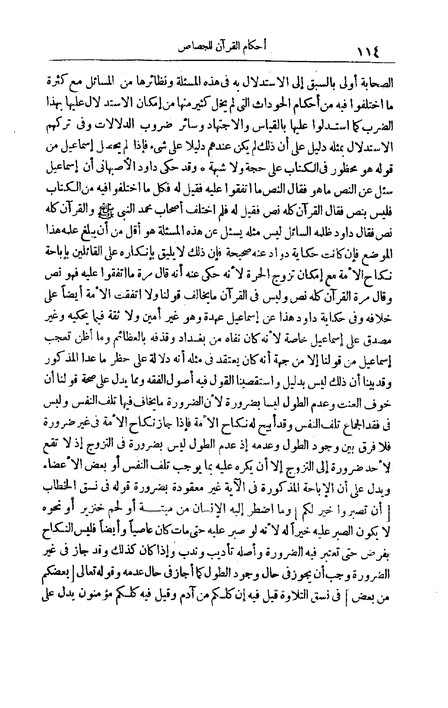 فِي الْكِتَابِ عَلَى حُجَّةٍ وَلَا شُبْهَةٍ وَقَدْ حَكَى دَاوُد الْأَصْبَهَانِيُّ أَنَّ إسْمَاعِيلَ سُئِلَ عَنْ النَّصِّ مَا هُوَ فَقَالَ النَّصُّ مَا اتَّفَقُوا عَلَيْهِ فَقِيلَ لَهُ فَكُلُّ مَا اخْتَلَفُوا فِيهِ مِنْ الْكِتَابِ فَلَيْسَ بِنَصٍّ فَقَالَ الْقُرْآنُ كُلُّهُ نَصٌّ فَقِيلَ لَهُ فَلِمَ اخْتَلَفَ أَصْحَابُ مُحَمَّدٍ النَّبِيِّ صَلَّى اللَّهُ عَلَيْهِ وَسَلَّمَ وَالْقُرْآنُ كُلُّهُ نَصٌّ فَقَالَ داود ظلمه السائل ليس مثله يسئل عَنْ هَذِهِ الْمَسْأَلَةِ هُوَ أَقَلُّ مِنْ أَنْ يَبْلُغَ عِلْمُهُ هَذَا الْمَوْضِعَ فَإِنْ كَانَتْ حِكَايَةُ دواد عَنْهُ صَحِيحَةً فَإِنَّ ذَلِكَ لَا يَلِيقُ بِإِنْكَارِهِ عَلَى الْقَائِلِينَ بِإِبَاحَةِ نِكَاحِ الْأَمَةِ مَعَ إمْكَانِ تَزَوُّجِ الْحُرَّةِ لِأَنَّهُ حُكِيَ عَنْهُ أَنَّهُ قَالَ مَرَّةً مَا اتَّفَقُوا عَلَيْهِ فَهُوَ نَصٌّ وَقَالَ مَرَّةً الْقُرْآنُ كُلُّهُ نَصٌّ وَلَيْسَ فِي الْقُرْآنِ مَا يُخَالِفُ قَوْلَنَا وَلَا اتَّفَقَتْ الْأُمَّةُ أَيْضًا عَلَى خِلَافِهِ وَفِي حِكَايَةِ دَاوُد هَذَا عَنْ إسْمَاعِيلَ عُهْدَةٌ وَهُوَ غَيْرُ أَمِينٍ وَلَا ثِقَةٍ فِيمَا يَحْكِيهِ وَغَيْرُ مُصَدَّقٍ عَلَى إسْمَاعِيلَ خَاصَّةً لِأَنَّهُ كَانَ نَفَاهُ مِنْ بَغْدَادَ وَقَذْفَهُ بِالْعَظَائِمِ وَمَا أَظُنُّ تَعَجُّبَ إسْمَاعِيلَ مِنْ قَوْلِنَا إلَّا مِنْ جِهَةِ أَنَّهُ كَانَ يَعْتَقِدُ فِي مِثْلِهِ أَنَّهُ دَلَالَةً عَلَى حَظْرِ مَا عَدَا الْمَذْكُورِ وَقَدْ بَيَّنَّا أَنَّ ذَلِكَ لَيْسَ بِدَلِيلٍ وَاسْتَقْصَيْنَا القول فيه أُصُولِ الْفِقْهِ وَمِمَّا يَدُلُّ عَلَى صِحَّةِ قَوْلِنَا أَنَّ خَوْفَ الْعَنَتِ وَعَدَمَ الطَّوْلِ لَيْسَا بِضَرُورَةٍ لِأَنَّ الضَّرُورَةَ مَا يُخَافُ فِيهَا تَلَفُ النَّفْسِ وَلَيْسَ فِي فَقْدِ الْجِمَاعِ تَلَفُ النَّفْسِ وَقَدْ أُبِيحَ لَهُ نِكَاحُ الْأَمَةِ فَإِذَا جَازَ نِكَاحُ الْأَمَةِ فِي غَيْرِ ضَرُورَةٍ فَلَا فَرْقَ بَيْنَ وُجُودِ الطَّوْلِ وَعَدَمِهِ إذْ عَدَمُ الطَّوْلِ لَيْسَ بِضَرُورَةٍ فِي التَّزَوُّجِ إذْ لَا تَقَعُ لِأَحَدٍ ضَرُورَةٌ إلَى التَّزَوُّجِ إلَّا أَنْ يُكْرَهَ عَلَيْهِ بِمَا يُوجِبُ تَلَفَ النَّفْسِ أَوْ بَعْضِ الْأَعْضَاءِ وَيَدُلُّ عَلَى أَنَّ الْإِبَاحَةَ الْمَذْكُورَةَ فِي الْآيَةِ غَيْرُ مَعْقُودَةٍ بِضَرُورَةٍ قَوْلُهُ فِي نَسَقِ الْخِطَابِ أَنْ تَصْبِرُوا خَيْرٌ لَكُمْ وَمَا اُضْطُرَّ إلَيْهِ الْإِنْسَانُ مِنْ مَيْتَةٍ أَوْ لَحْمِ خِنْزِيرٍ أَوْ نَحْوِهِ لَا يَكُونُ الصَّبْرُ عَلَيْهِ خَيْرًا لَهُ لِأَنَّهُ لَوْ صَبَرَ عَلَيْهِ حَتَّى مَاتَ كَانَ عَاصِيًا وَأَيْضًا فَلَيْسَ النِّكَاحُ بِفَرْضٍ حَتَّى تُعْتَبَرَ فِيهِ الضَّرُورَةُ وَأَصْلُهُ تَأْدِيبٌ وَنَدْبٌ وَإِذَا كَانَ كَذَلِكَ وَقَدْ جَازَ فِي غَيْرِ الضَّرُورَةِ وَجَبَ أَنْ يَجُوزَ فِي حَالِ وجود الطول كما أجاز فِي حَالِ عَدَمِهِ وقَوْله تَعَالَى بَعْضُكُمْ مِنْ بَعْضٍ فِي نَسَقِ التِّلَاوَةِ قِيلَ فِيهِ إنَّ كُلَّكُمْ مِنْ آدَمَ وَقِيلَ فِيهِ كُلُّكُمْ مُؤْمِنُونَ يَدُلُّ على