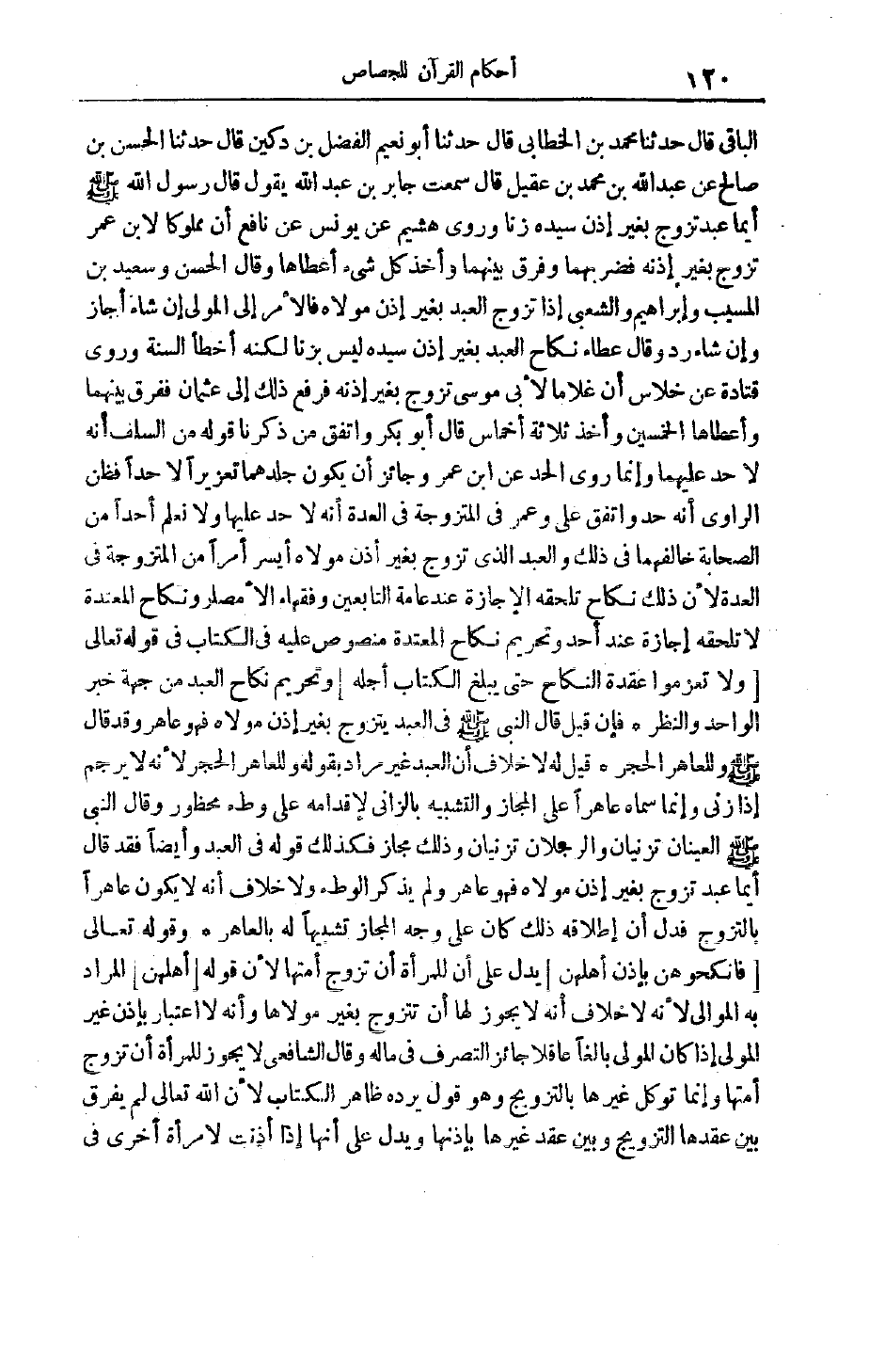 وَرَوَى هُشَيْمٌ عَنْ يُونُسَ عَنْ نَافِعٍ أَنَّ مَمْلُوكًا لِابْنِ عُمَرَ تَزَوَّجَ بِغَيْرِ إذْنِهِ فَضَرَبَهُمَا وَفَرَّقَ بَيْنَهُمَا وَأَخَذَ كُلَّ شَيْءِ أَعْطَاهَا وَقَالَ الْحَسَنُ وَسَعِيدُ بْنُ الْمُسَيِّبِ وَإِبْرَاهِيمُ وَالشَّعْبِيُّ إذَا تَزَوَّجَ الْعَبْدُ بِغَيْرِ إذْنِ مَوْلَاهُ فَالْأَمْرُ إلَى الْمَوْلَى إنْ شَاءَ أَجَازَ وَإِنْ شَاءَ رَدَّ وَقَالَ عَطَاءُ نِكَاحُ العبد بغير إذن سيده ليس بزنا لكنه أَخْطَأَ السُّنَّةَ وَرَوَى قَتَادَةُ عَنْ خِلَاسٍ أَنَّ غُلَامًا لِأَبِي مُوسَى تَزَوَّجَ بِغَيْرِ إذْنِهِ فَرُفِعَ ذَلِكَ إلَى عُثْمَانَ فَفَرَّقَ بَيْنَهُمَا وَأَعْطَاهَا الْخُمُسَيْنِ وَأَخَذَ ثَلَاثَةَ أَخْمَاسٍ قَالَ أَبُو بَكْرٍ وَاتَّفَقَ من ذكرنا قوله من السلف أنه لاحد عَلَيْهِمَا وَإِنَّمَا رُوِيَ الْحَدُّ عَنْ ابْنِ عُمَرَ وَجَائِزٌ أَنْ يَكُونَ جَلَدَهُمَا تَعْزِيرًا لَا حَدًّا فَظَنَّ الرَّاوِي أَنَّهُ حَدٌّ وَاتَّفَقَ عَلِيٌّ وَعُمَرُ في المتزوجة في العدة أنه لاحد عَلَيْهَا وَلَا نَعْلَمُ أَحَدًا مِنْ الصَّحَابَةِ خَالَفَهُمَا فِي ذَلِكَ وَالْعَبْدُ الَّذِي تَزَوَّجَ بِغَيْرِ إذْنِ مَوْلَاهُ أَيْسَرُ أَمْرًا مِنْ الْمُتَزَوِّجَةِ فِي الْعِدَّةِ لِأَنَّ ذَلِكَ نِكَاحٌ تَلْحَقُهُ الْإِجَازَةُ عِنْدَ عَامَّةِ التَّابِعِينَ وَفُقَهَاءِ الْأَمْصَارِ وَنِكَاحُ الْمُعْتَدَّةِ لَا تَلْحَقُهُ إجَازَةٌ عِنْدَ أَحَدٍ وَتَحْرِيمُ نِكَاحِ الْمُعْتَدَّةِ مَنْصُوصٌ عَلَيْهِ فِي الْكِتَابِ فِي قَوْله تَعَالَى وَلا تَعْزِمُوا عُقْدَةَ النِّكاحِ حَتَّى يَبْلُغَ الْكِتابُ أَجَلَهُ وَتَحْرِيمُ نِكَاحِ الْعَبْدِ مِنْ جِهَةِ خَبَرِ الْوَاحِدِ وَالنَّظَرِ فَإِنْ قِيلَ
