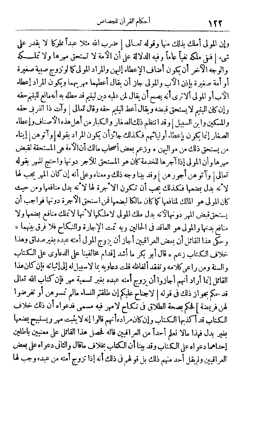 وَأَنَّ الْمَوْلَى أَمْلَكُ بِذَلِكَ مِنْهَا وقَوْله تَعَالَى ضَرَبَ اللَّهُ مَثَلًا عَبْداً مَمْلُوكاً لا يَقْدِرُ عَلى شَيْءٍ فَنَفَى مِلْكَهُ نَفْيًا عَامًا وَفِيهِ الدَّلَالَةُ عَلَى أَنَّ الْأَمَةَ لَا تَسْتَحِقُّ مَهْرَهَا وَلَا تَمْلِكُهُ وَالْوَجْهُ الْآخَرُ أَنْ يَكُونَ أَضَافَ الْإِعْطَاءَ إلَيْهِنَّ وَالْمُرَادُ الْمَوْلَى كَمَا لَوْ تَزَوَّجَ صَبِيَّةً صَغِيرَةً أَوْ أَمَةً صَغِيرَةً بِإِذْنِ الْأَبِ وَالْمَوْلَى جَازَ أَنْ يُقَالَ أَعْطِهِمَا مَهْرَيْهِمَا وَيَكُونُ الْمُرَادُ إعْطَاءَ الْأَبِ أَوْ الْمَوْلَى أَلَا تَرَى أَنَّهُ يَصِحُّ أَنْ يُقَالَ لِمَنْ عَلَيْهِ دَيْنٌ لِيَتِيمٍ قَدْ مَطَلَهُ بِهِ إنَّهُ مَانِعٌ لِلْيَتِيمِ حَقَّهُ وَإِنْ كَانَ الْيَتِيمُ لَا يَسْتَحِقُّ قَبْضَهُ وَيُقَالُ أَعْطِ الْيَتِيمَ حَقَّهُ وَقَالَ تَعَالَى وَآتِ ذَا الْقُرْبى حَقَّهُ وَالْمِسْكِينَ وَابْنَ السَّبِيلِ وَقَدْ انْتَظَمَ ذَلِكَ الصِّغَارَ وَالْكِبَارَ مِنْ أَهْلِ هَذِهِ الْأَصْنَافِ وَإِعْطَاءُ الصِّغَارِ إنَّمَا يَكُونُ بِإِعْطَاءِ أَوْلِيَائِهِمْ فَكَذَلِكَ جَائِزٌ أَنْ يَكُونَ الْمُرَادُ بِقَوْلِهِ وَآتُوهُنَّ إيتَاءَ مَنْ يَسْتَحِقُّ ذَلِكَ مِنْ مَوَالِيهِنَّ وَزَعَمَ بَعْضُ أَصْحَابِ مَالِكٍ أَنَّ الْأَمَةَ هِيَ الْمُسْتَحِقَّةُ لِقَبْضِ مَهْرِهَا وَأَنَّ الْمَوْلَى إذَا آجَرَهَا لِلْخِدْمَةِ كَانَ هُوَ الْمُسْتَحِقَّ لِلْأَجْرِ دُونَهَا وَاحْتَجَّ لِلْمَهْرِ بقوله تعالى وَآتُوهُنَّ أُجُورَهُنَّ وَقَدْ بَيَّنَّا وَجْهَ ذَلِكَ وَمَعْنَاهُ وَعَلَى أَنَّهُ إنْ كَانَ الْمَهْرُ يَجِبُ لَهَا لِأَنَّهُ بَدَلُ بُضْعِهَا فَكَذَلِكَ